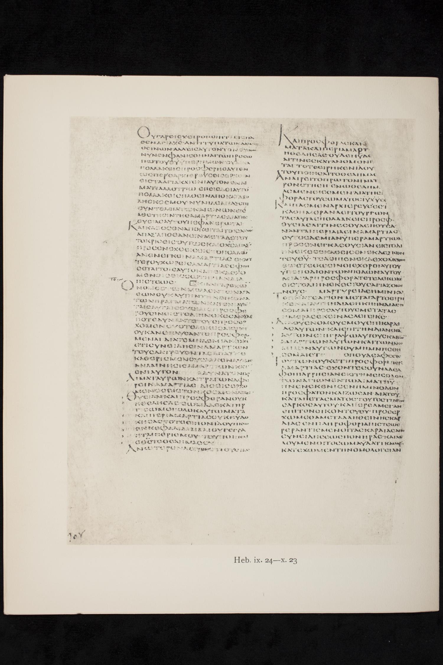 Codex Alexandrinus is a fifth century manuscript of the Greek Old Testament, the New Testament, and the Clementine Epistles on parchment. Images are from the 1879–1883 and 1909 full-sized black and white facsimiles produced by the British Museum. For more recent images, please visit the British Museum