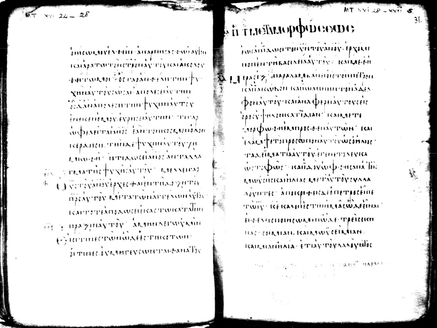 Ninth century majuscule of the Gospels on parchment; 309 leaves, single column, 16+ lines per column. Digital images are from microfilm.