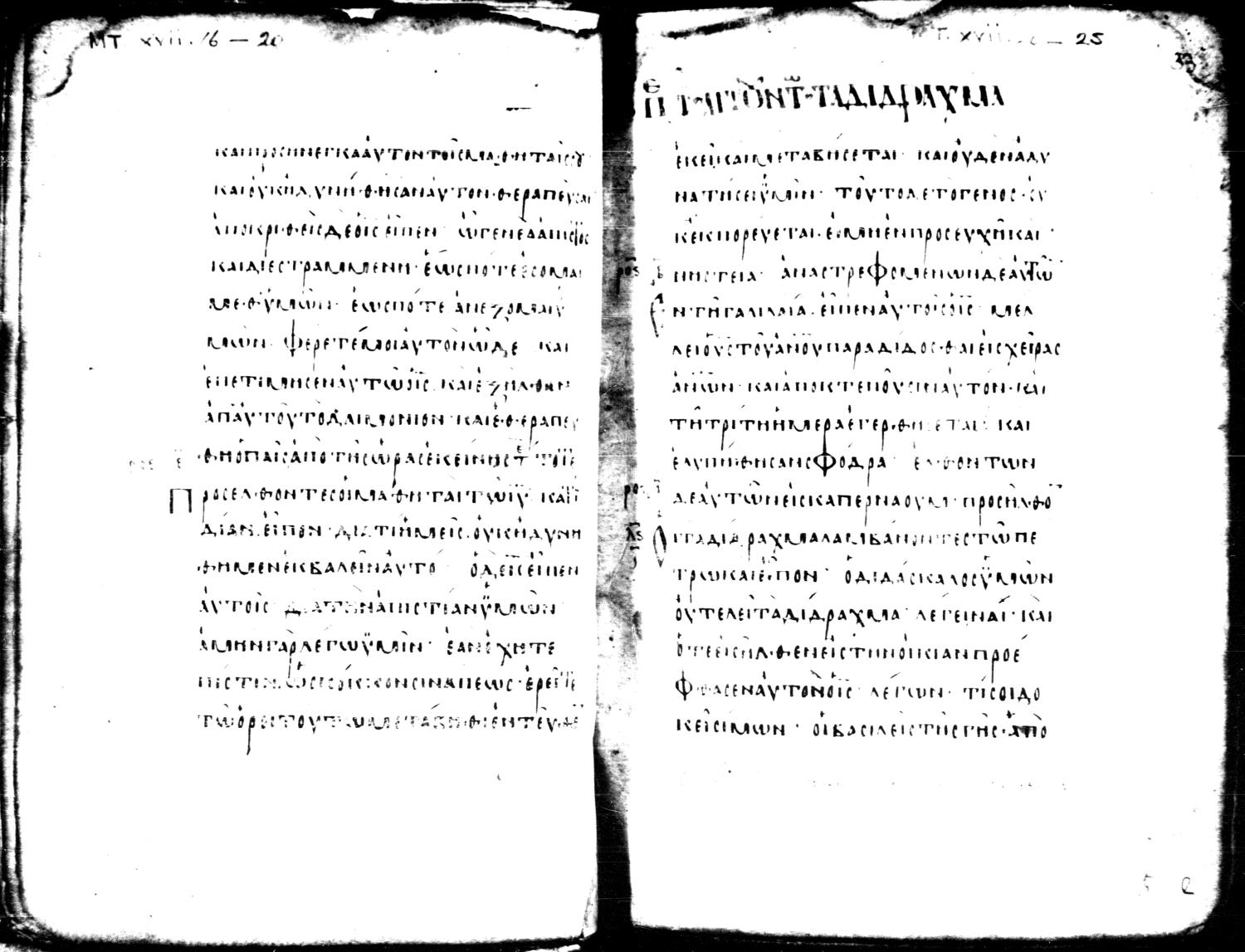 Ninth century majuscule of the Gospels on parchment; 309 leaves, single column, 16+ lines per column. Digital images are from microfilm.