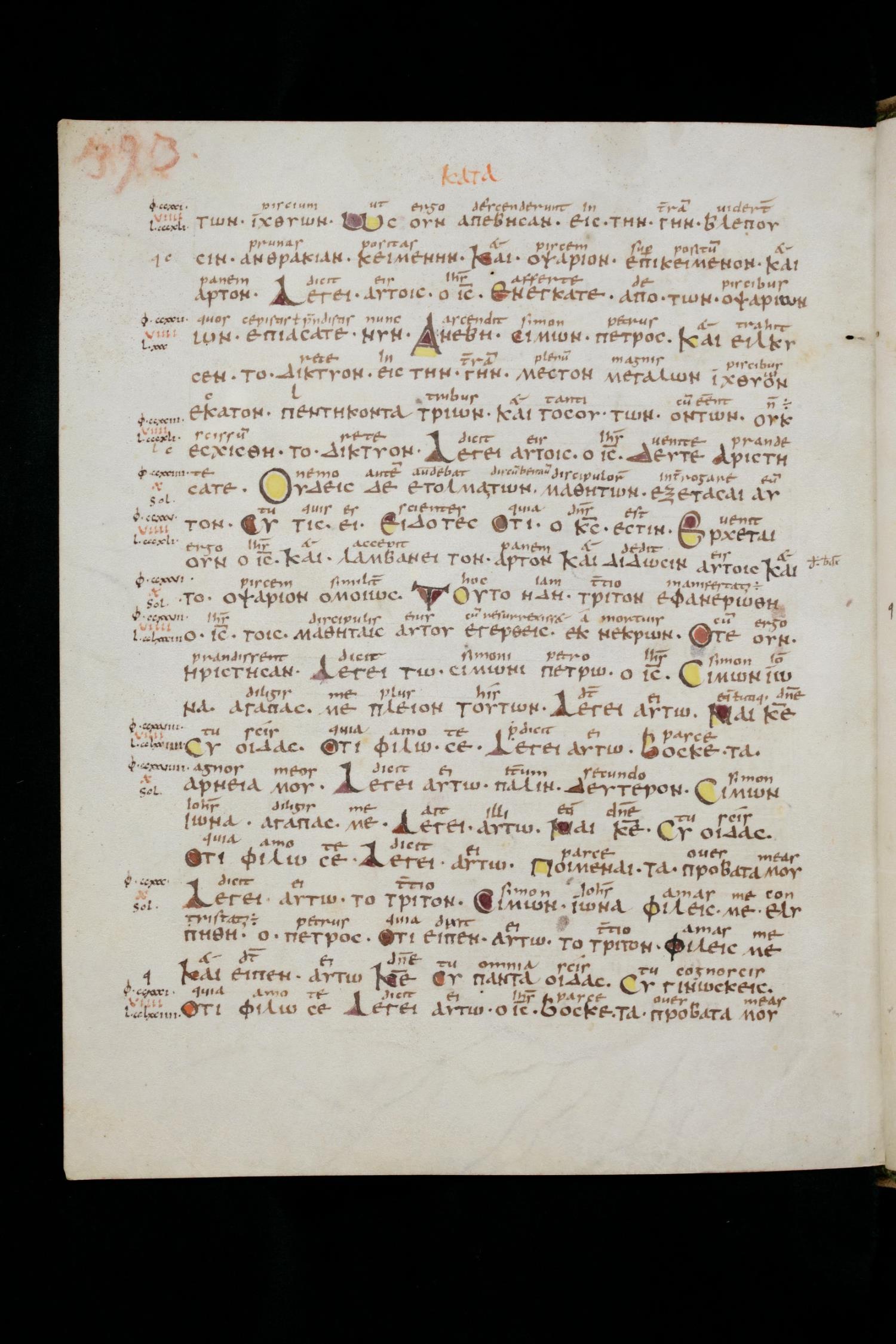Ὅτε οὖν ἠρίστησαν λέγει τῷ Σίμωνι Πέτρῳ ὁ Ἰησοῦς Σίμων Ἰωάνου / Ἰωάννου, ἀγαπᾷς με πλέον τούτων; λέγει αὐτῷ Ναί, κύριε, σὺ οἶδας ὅτι φιλῶ σε. λέγει αὐτῷ Βόσκε τὰ ἀρνία μου.