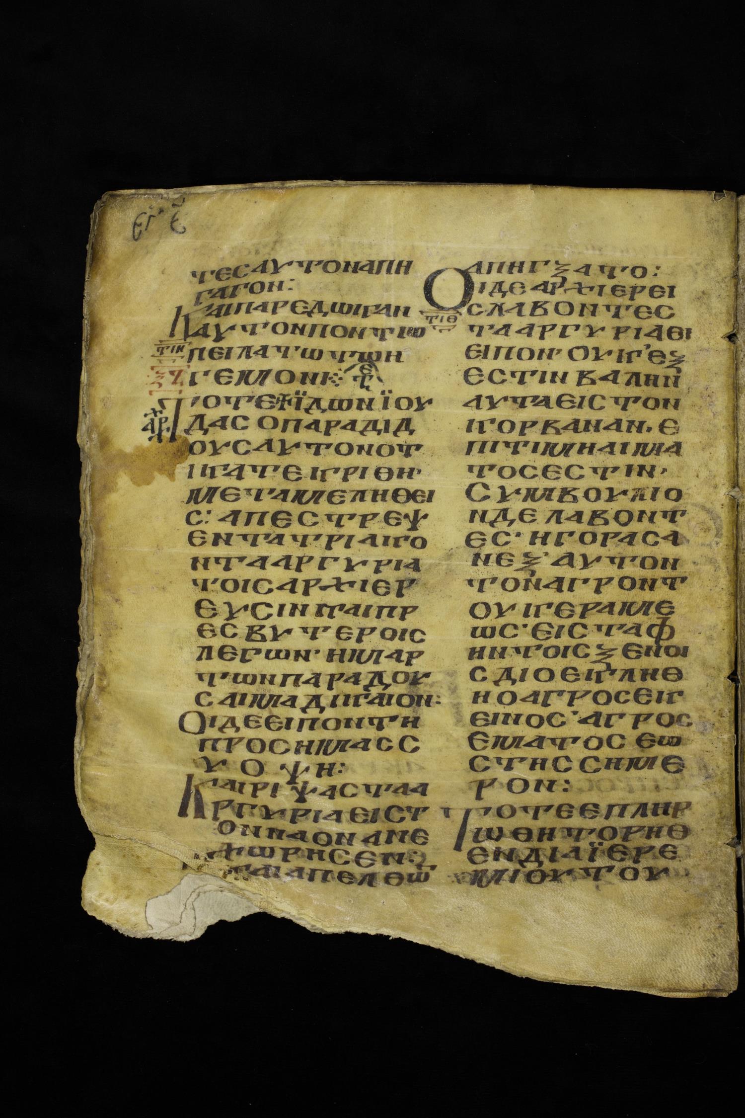 Ninth century majuscule of the Gospels on parchment; 249 leaves, 2 columns, 22-28 lines per column. Images were taken at the National Centre of Manuscripts in the Republic of Georgia.