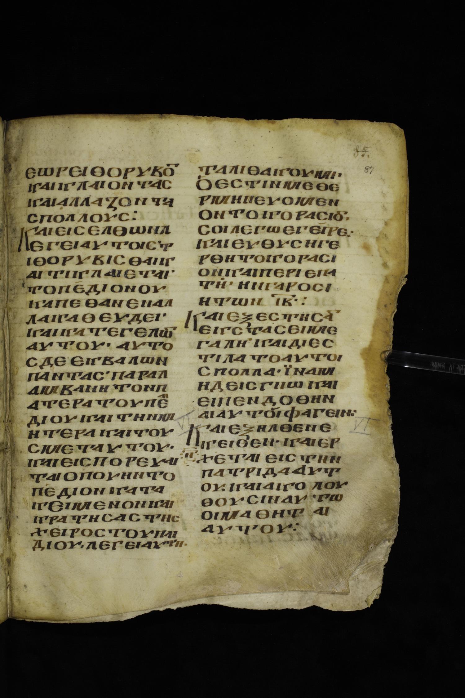 Ninth century majuscule of the Gospels on parchment; 249 leaves, 2 columns, 22-28 lines per column. Images were taken at the National Centre of Manuscripts in the Republic of Georgia.
