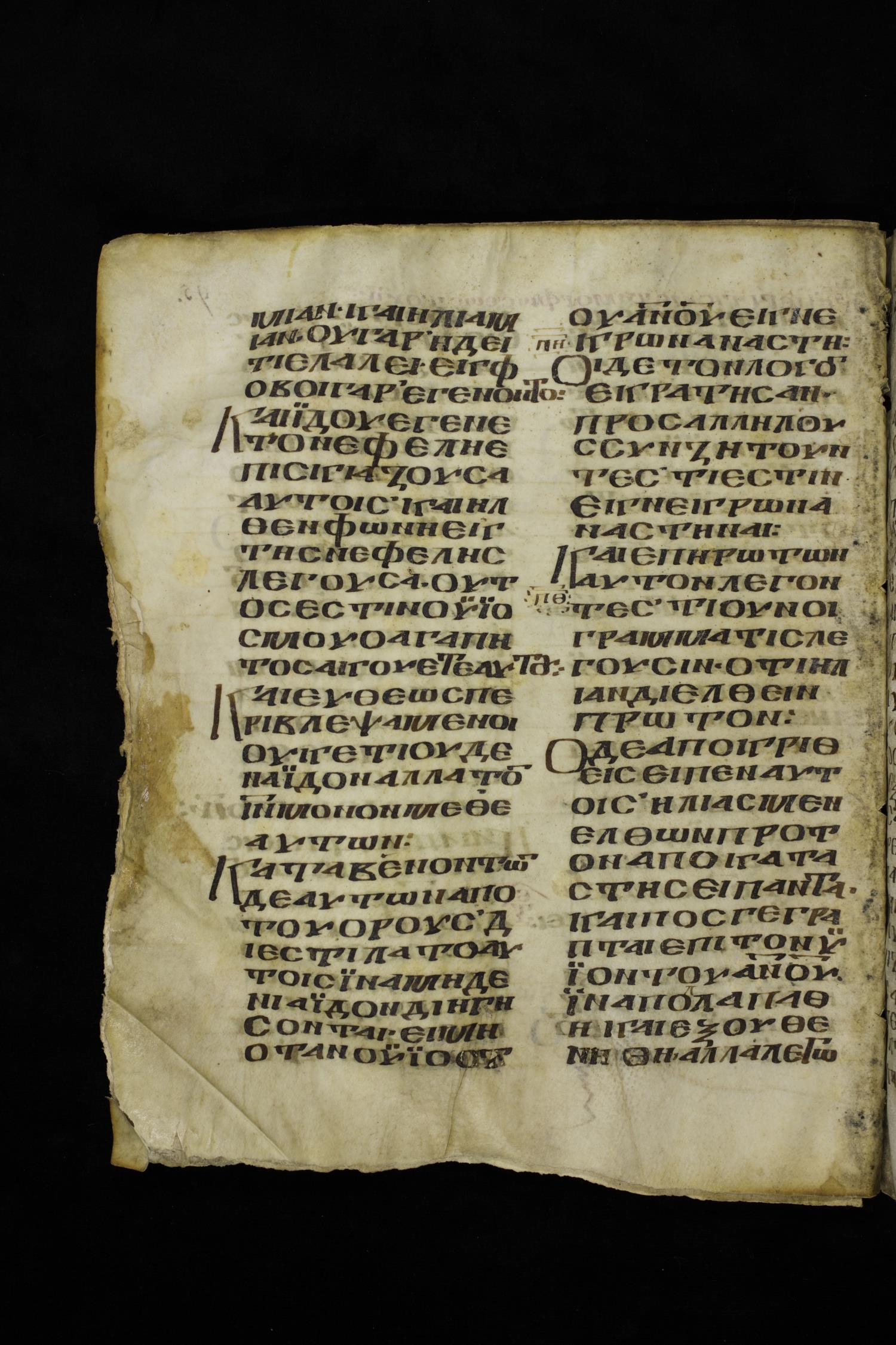 Ninth century majuscule of the Gospels on parchment; 249 leaves, 2 columns, 22-28 lines per column. Images were taken at the National Centre of Manuscripts in the Republic of Georgia.