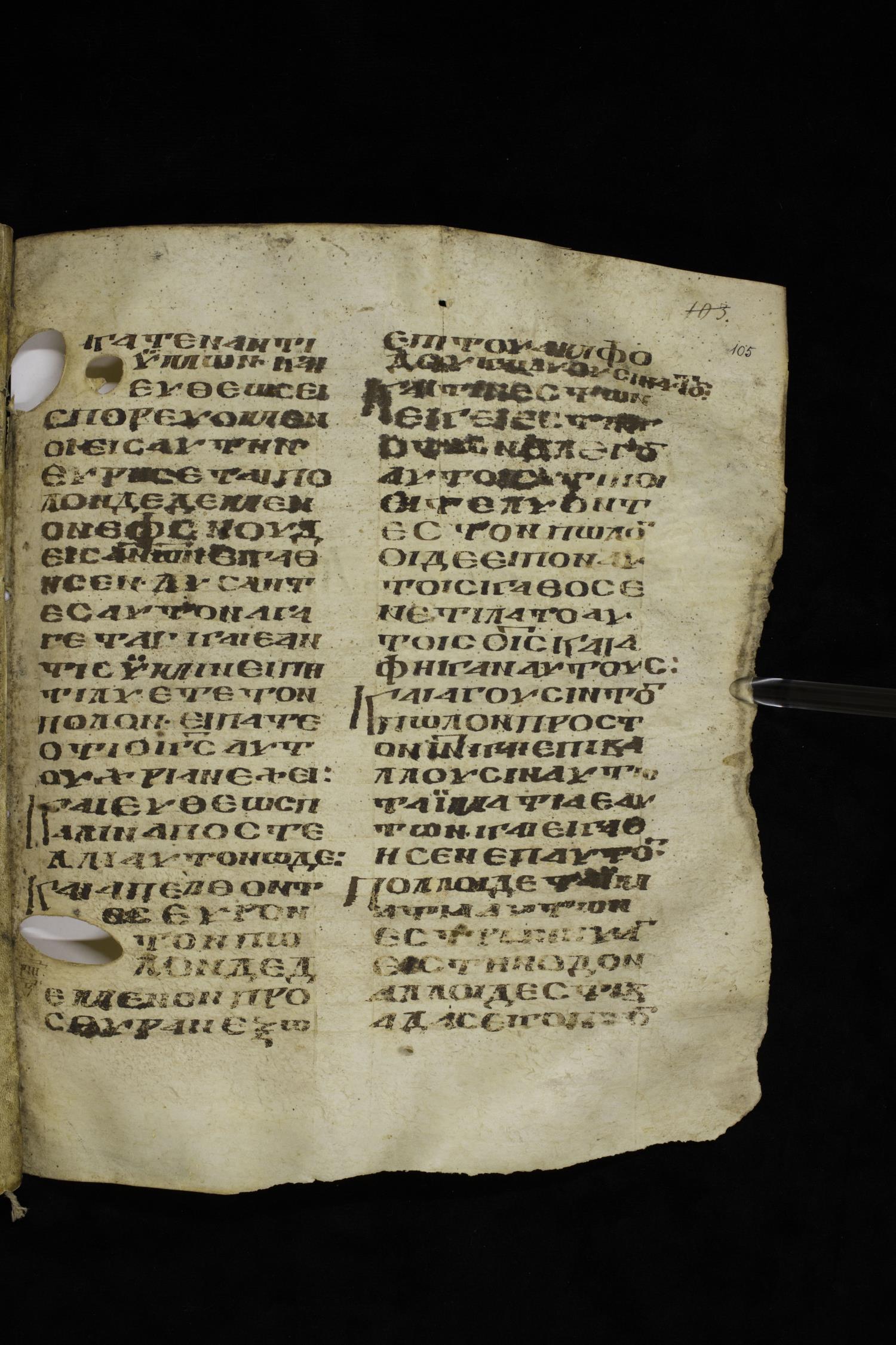 Ninth century majuscule of the Gospels on parchment; 249 leaves, 2 columns, 22-28 lines per column. Images were taken at the National Centre of Manuscripts in the Republic of Georgia.