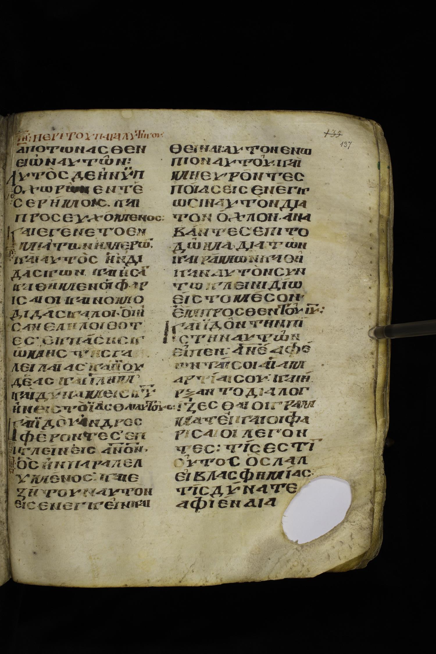 Ninth century majuscule of the Gospels on parchment; 249 leaves, 2 columns, 22-28 lines per column. Images were taken at the National Centre of Manuscripts in the Republic of Georgia.