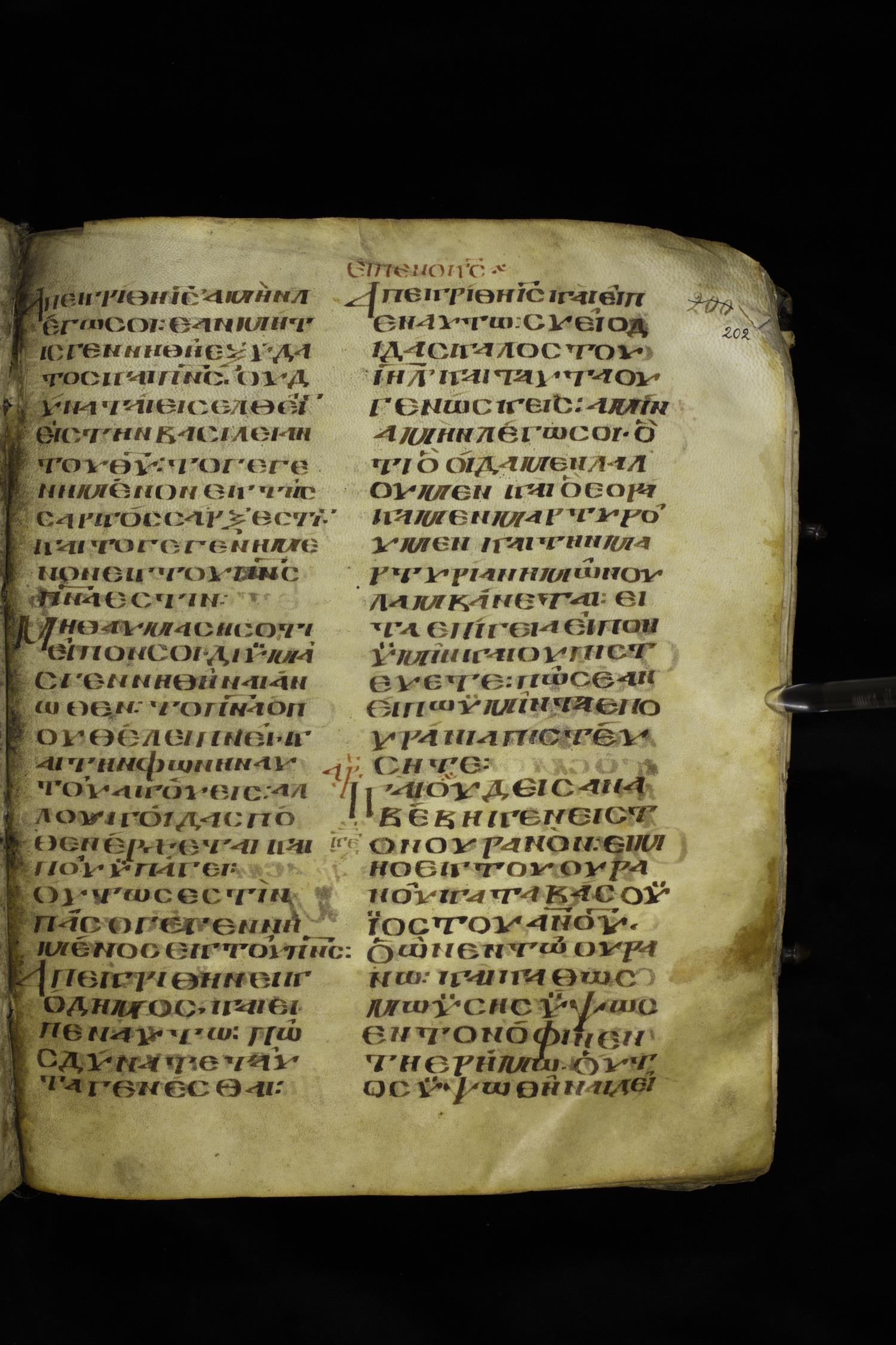 Ninth century majuscule of the Gospels on parchment; 249 leaves, 2 columns, 22-28 lines per column. Images were taken at the National Centre of Manuscripts in the Republic of Georgia.