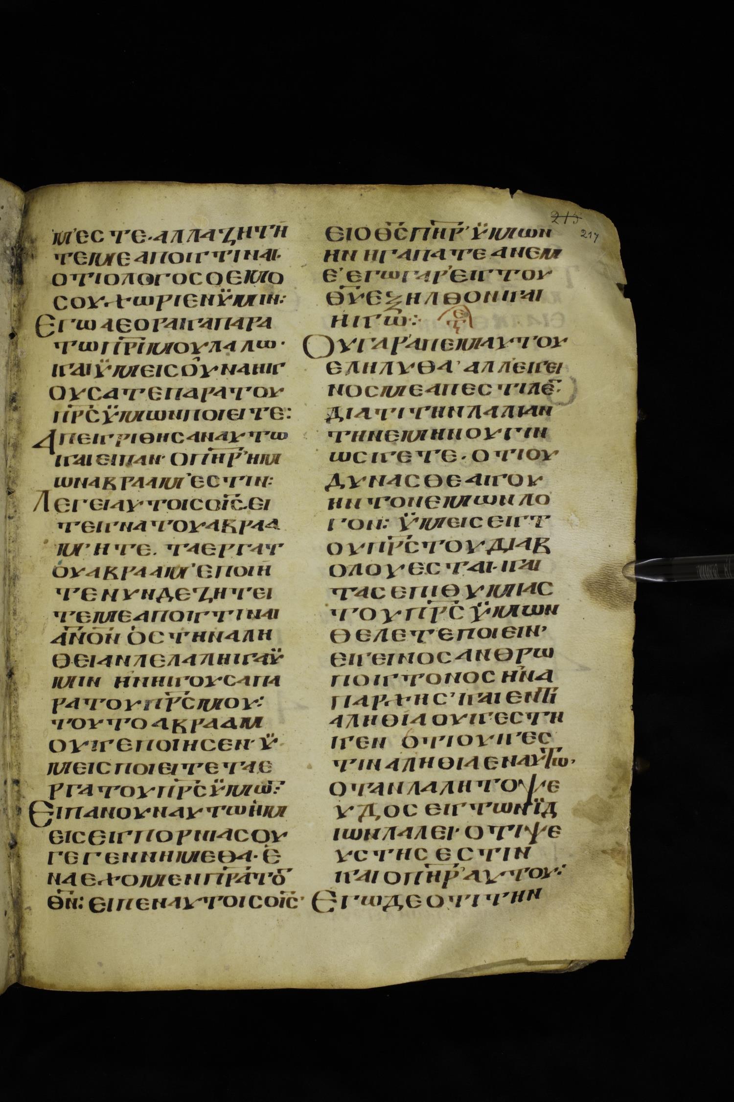 Ninth century majuscule of the Gospels on parchment; 249 leaves, 2 columns, 22-28 lines per column. Images were taken at the National Centre of Manuscripts in the Republic of Georgia.