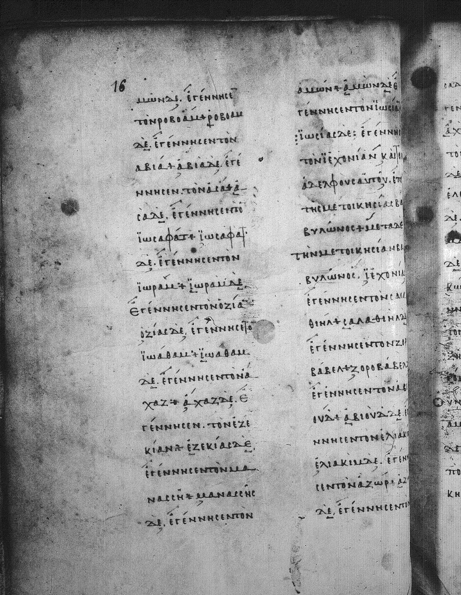 Ὀζείας / Ὀζίας δὲ ἐγέννησεν τὸν Ἰωαθάμ, Ἰωαθὰμ δὲ ἐγέννησεν τὸν Ἄχας / Ἀχάζ, Ἄχας / Ἀχὰζ δὲ ἐγέννησεν τὸν Ἑζεκίαν,