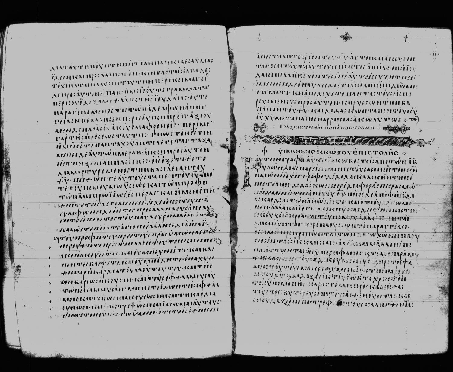 Ninth century majuscule of the Apostolos and Paul on parchment; 149 leaves, single column, 30 lines per column. Digital images are from microfilm.