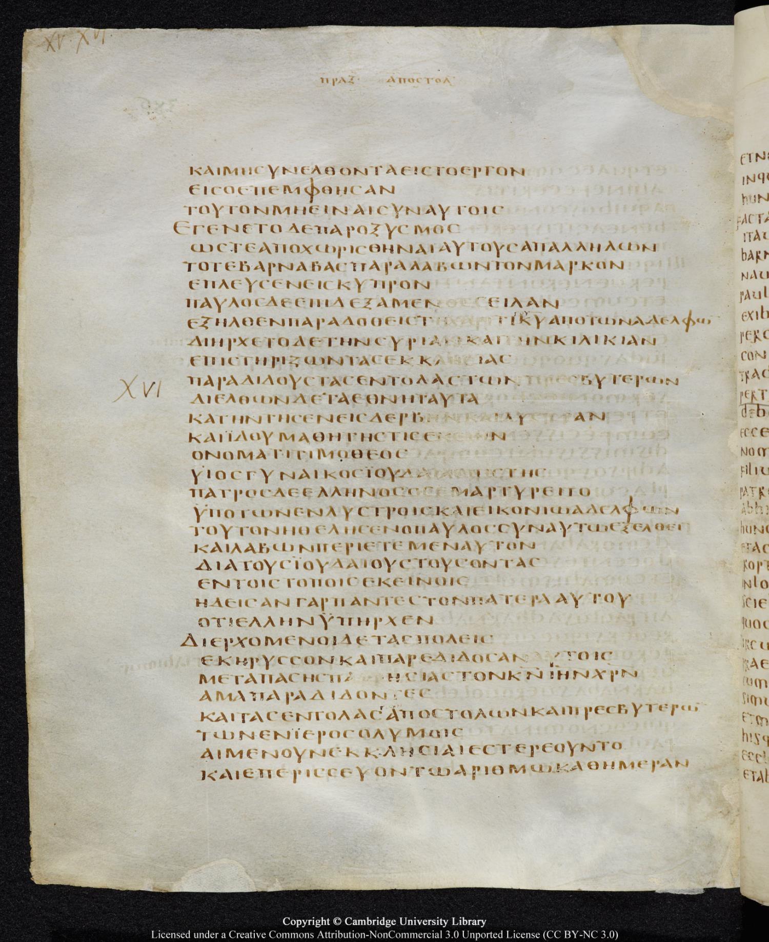 Codex Bezae is a fifth century majuscule of the Gospels and Apostolos on parchment; Greek-Latin diglot; 415 leaves, single column, 33 lines per column. For more information about these images, please visit the University of Cambridge.