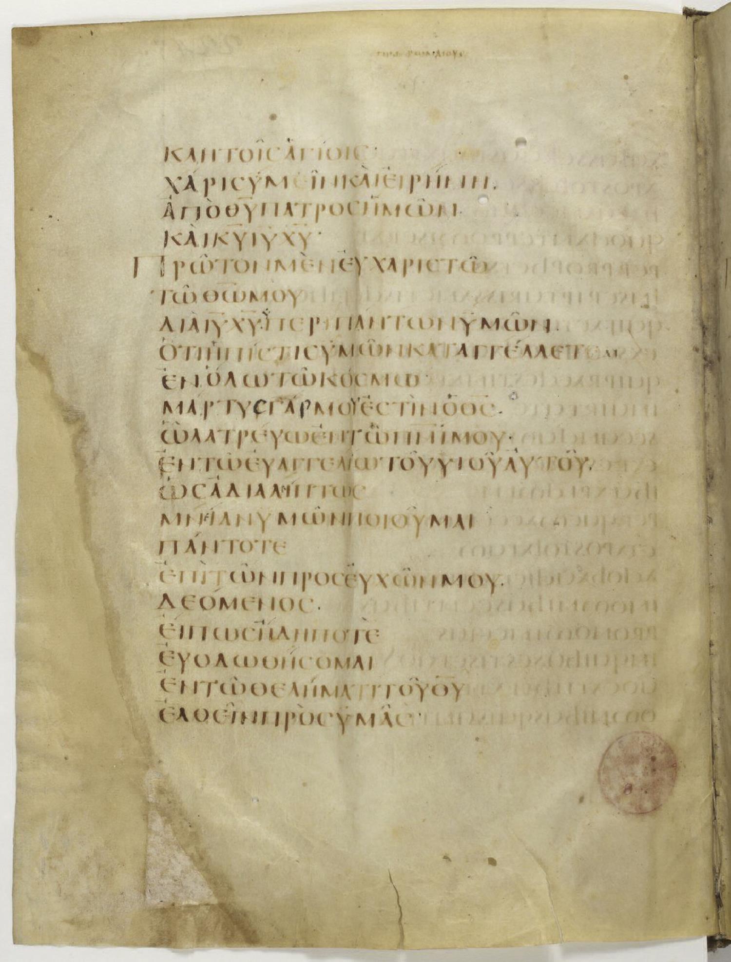 Πρῶτον μὲν εὐχαριστῶ τῷ θεῷ μου διὰ Ἰησοῦ Χριστοῦ περὶ πάντων ὑμῶν, ὅτι ἡ πίστις ὑμῶν καταγγέλλεται ἐν ὅλῳ τῷ κόσμῳ.