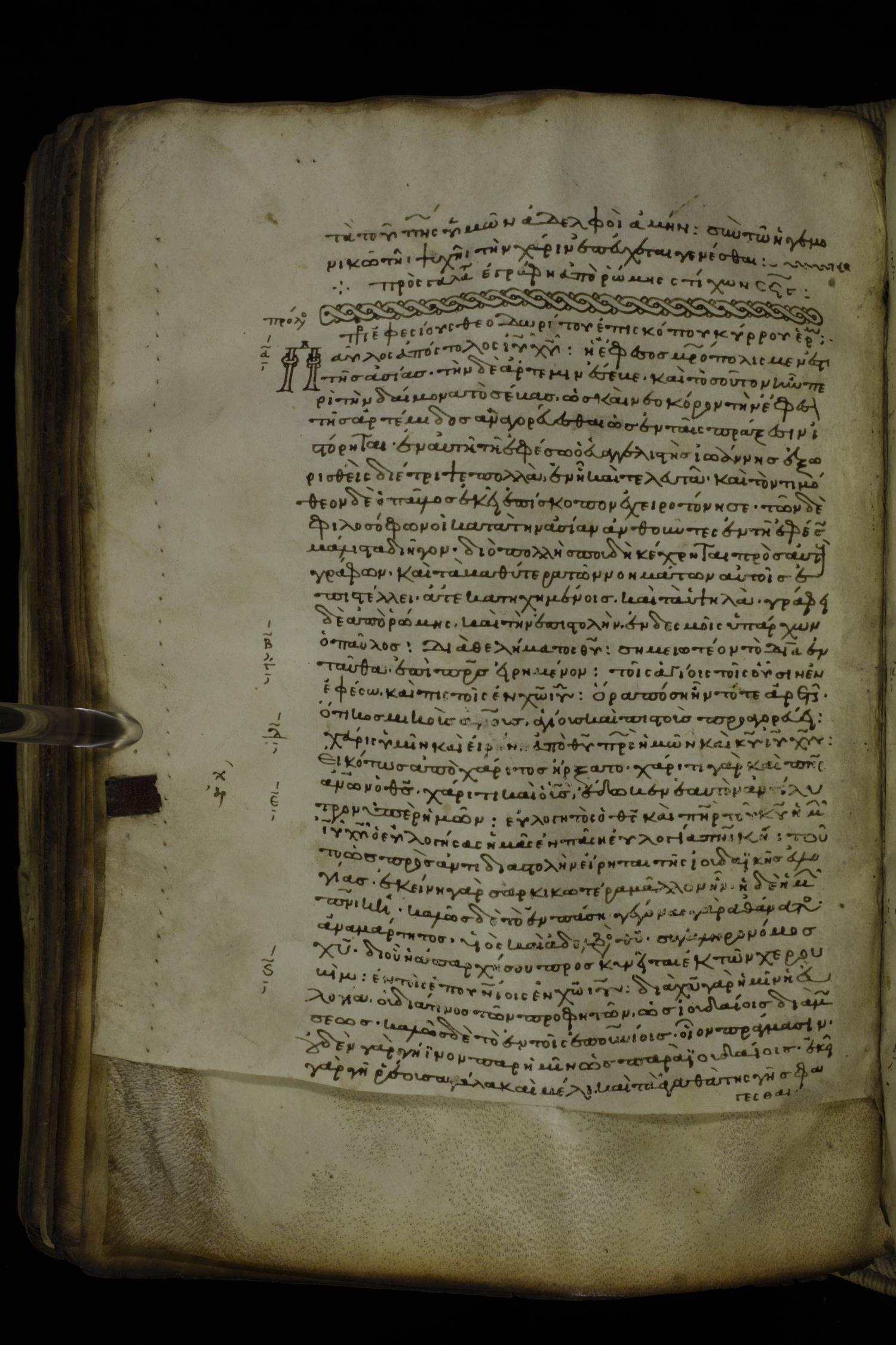 Tenth century majuscule of Paul with commentary on parchment; 333 leaves, 1 column, 31 lines per column. Images were taken at the National Library of Greece in Athens.