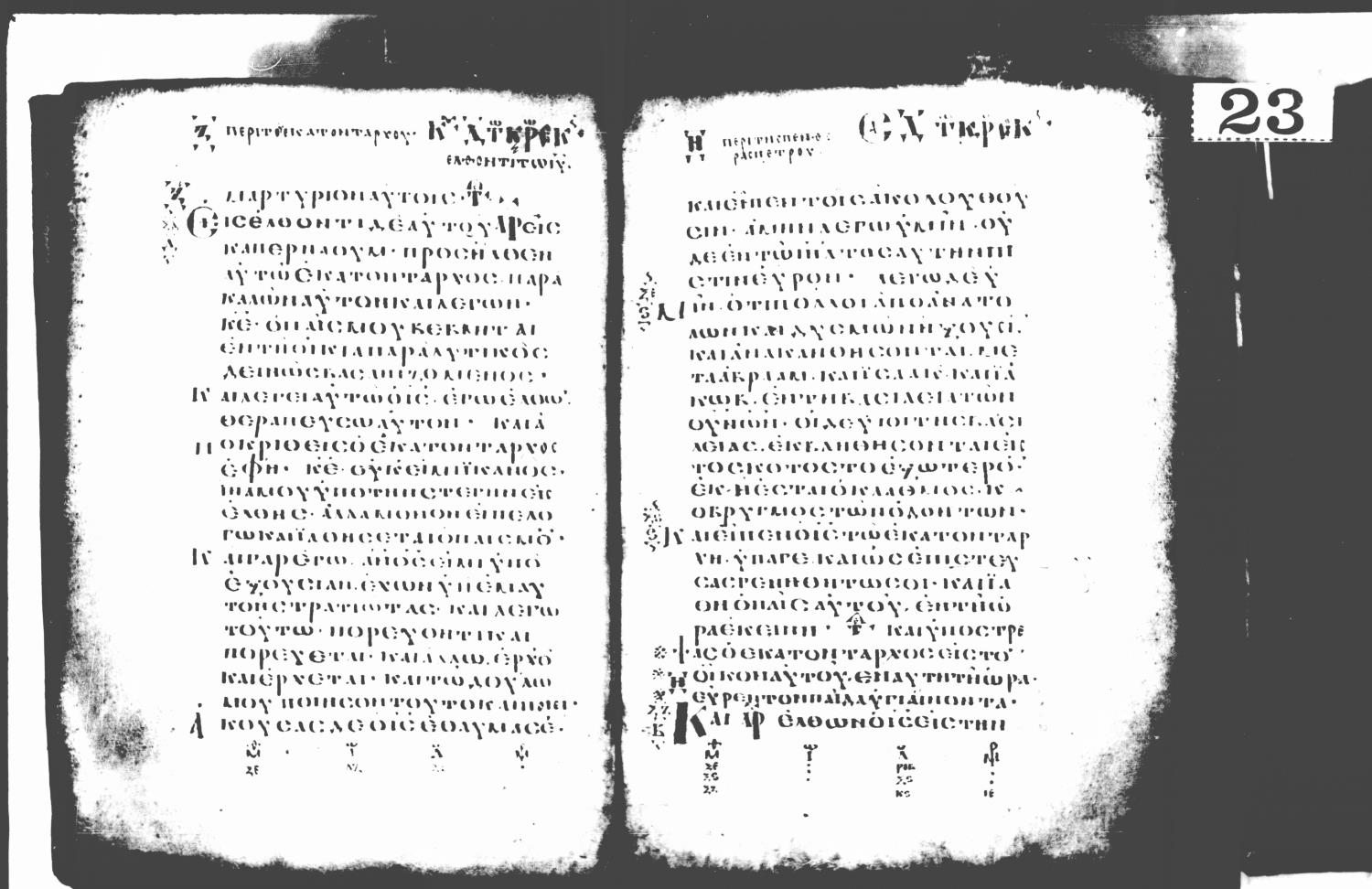 Codex Basilensis is an eighth century majuscule of the Gospels on parchment; 318 leaves, single column, 23-26 lines per column. Digital images are from microfilm.