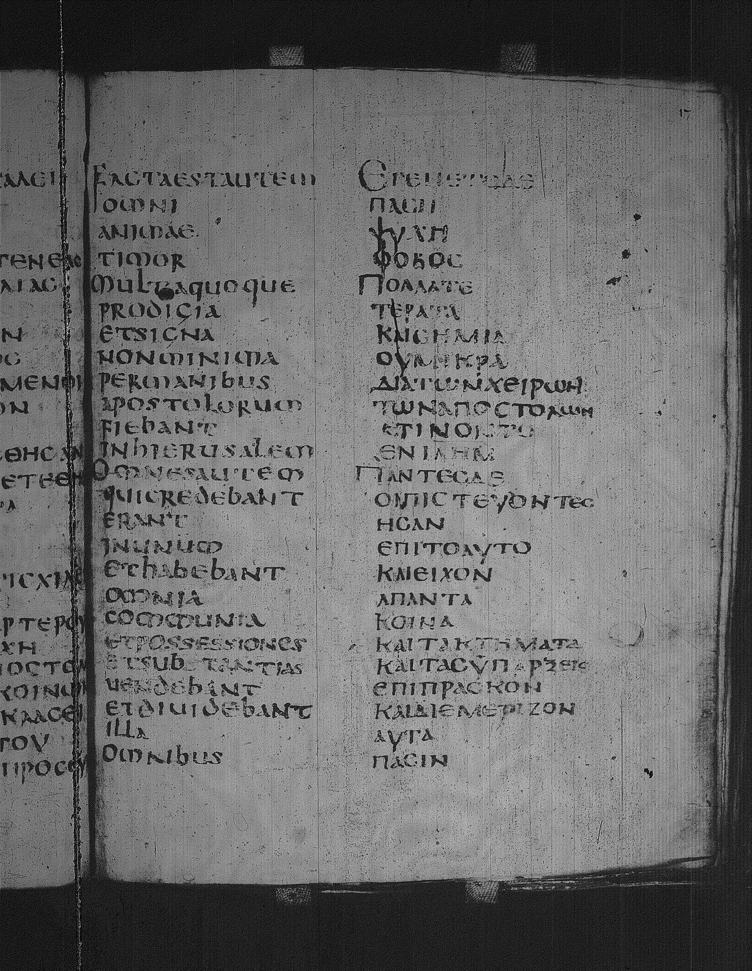 Codex Laudianus is a sixth century manuscript of the Apostolos on parchment; Greek-Latin diglot; 227 leaves, 2 columns, 24+ lines per column. For more recent images, please visit the Bodleian Library