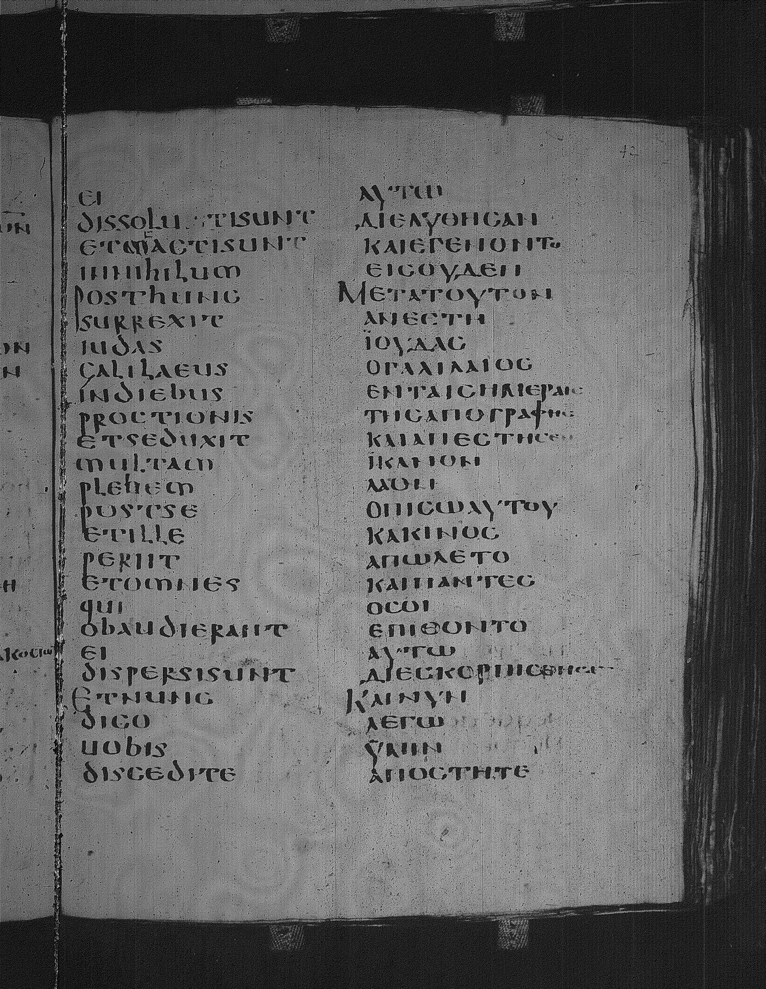 Codex Laudianus is a sixth century manuscript of the Apostolos on parchment; Greek-Latin diglot; 227 leaves, 2 columns, 24+ lines per column. For more recent images, please visit the Bodleian Library
