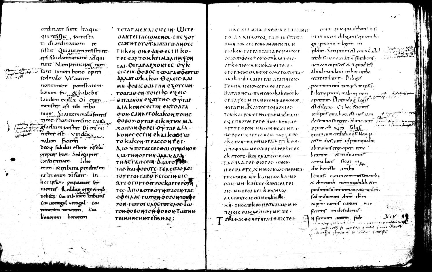 Codex Augiensis is a ninth century manuscript of Paul on parchment; Greek-Latin diglot; 136 leaves, 2 columns, 28 lines per column.
