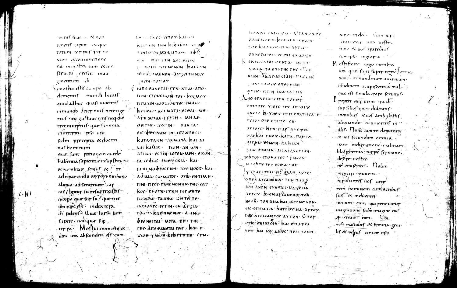 Codex Augiensis is a ninth century manuscript of Paul on parchment; Greek-Latin diglot; 136 leaves, 2 columns, 28 lines per column.