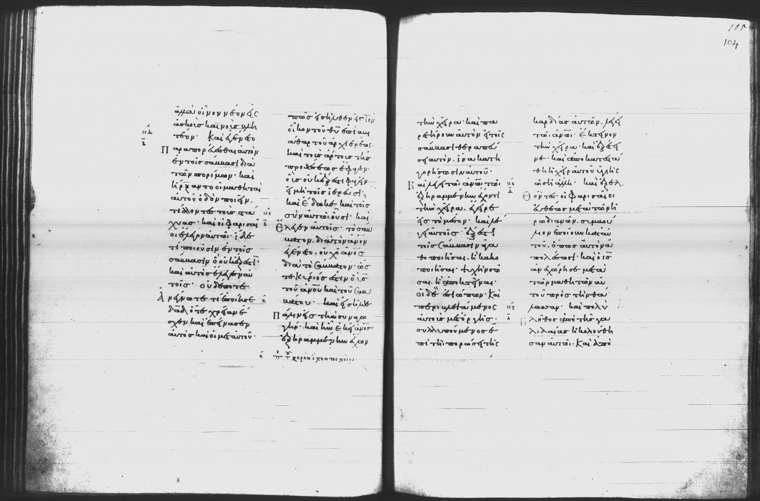 Tenth century minuscule of the Gospels on parchment; 298 leaves, 2 columns, 19 lines per column. Digital images are from microfilm.