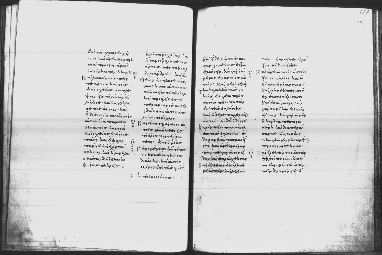 Tenth century minuscule of the Gospels on parchment; 298 leaves, 2 columns, 19 lines per column. Digital images are from microfilm.