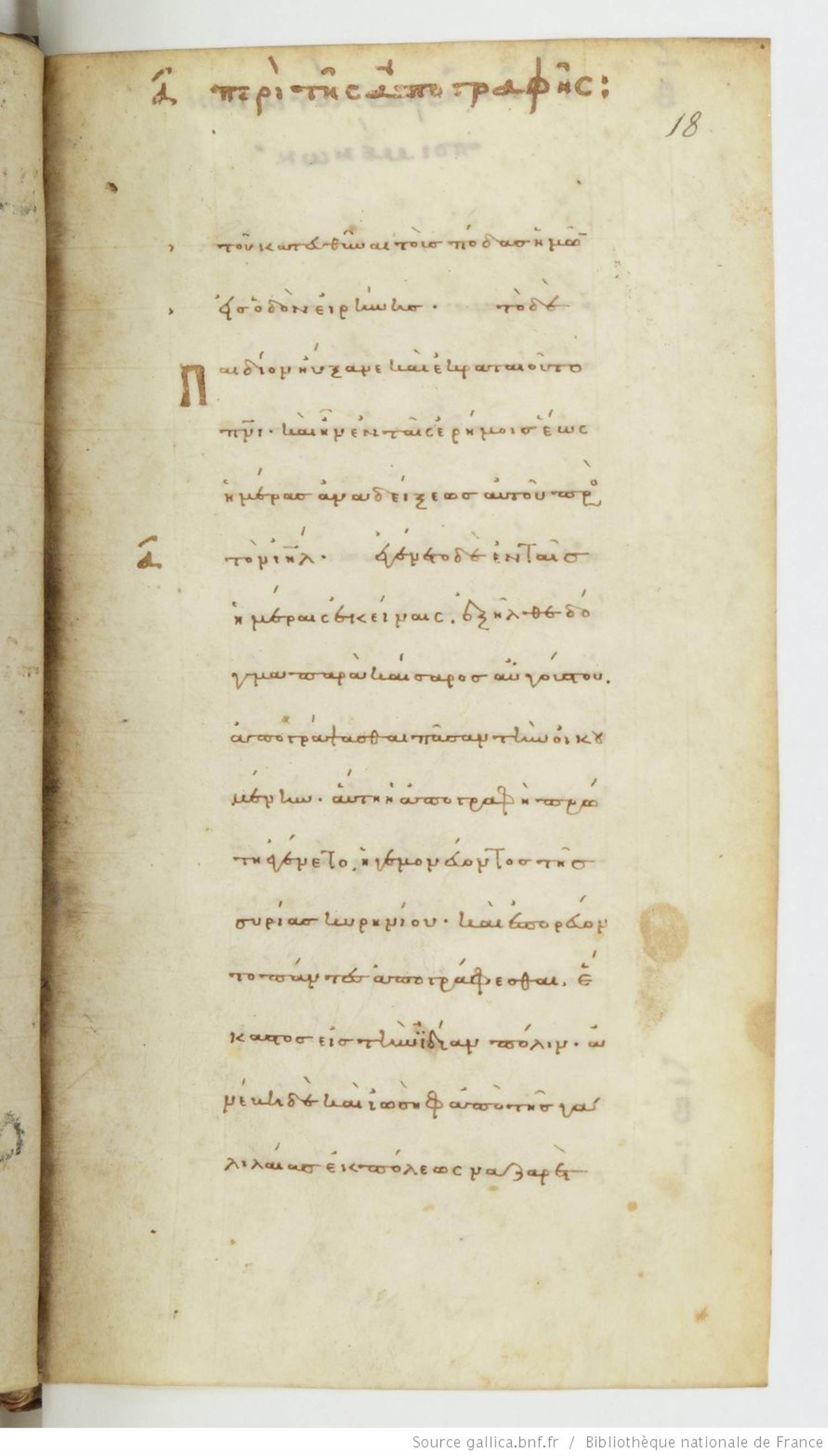 Twelfth century minuscule of the Gospels on parchment; 504 leaves, single column, 16 lines per column. These images are from Gr. 122, containing 274 leaves of Luke and John. For recent images, please visit the Bibliothèque Nationale.