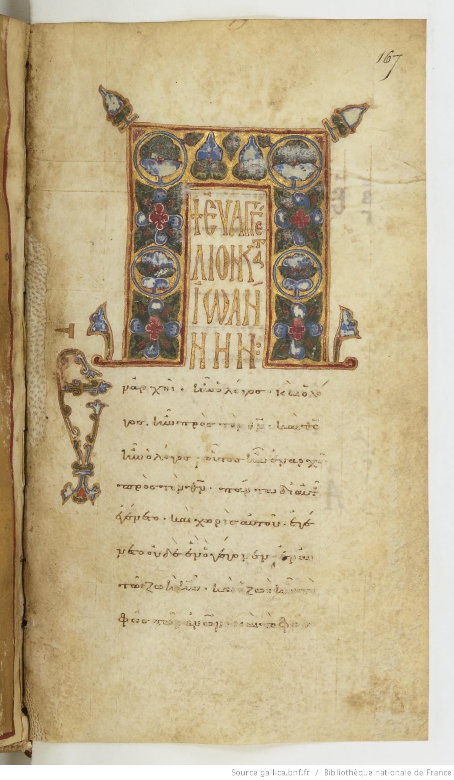 Twelfth century minuscule of the Gospels on parchment; 504 leaves, single column, 16 lines per column. These images are from Gr. 122, containing 274 leaves of Luke and John. For recent images, please visit the Bibliothèque Nationale.