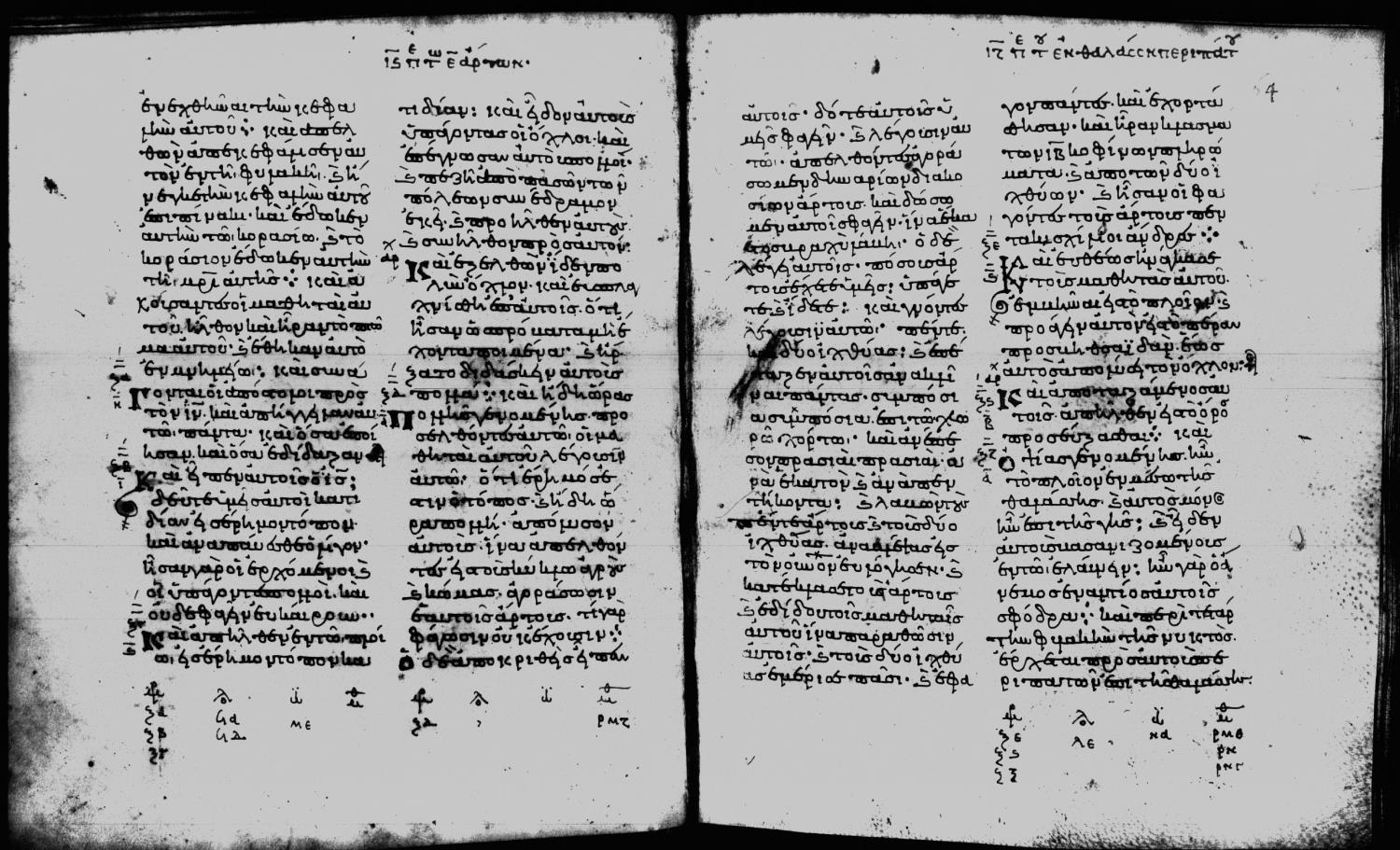 Eleventh century minuscule of the Gospels on parchment; 188 leaves, 2 columns, 25-28 lines per column. Digital images are from microfilm.