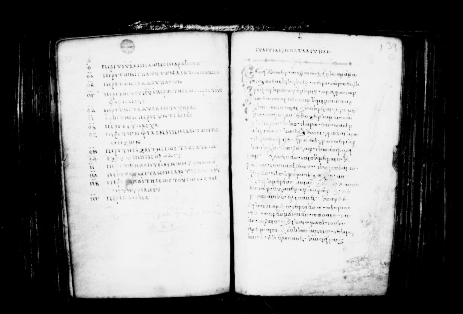 Tenth century minuscule of the Gospels on parchment; 289 leaves, single column, 21 lines per column. Digital images are from microfilm. These images can be found at the Library of Congress.
