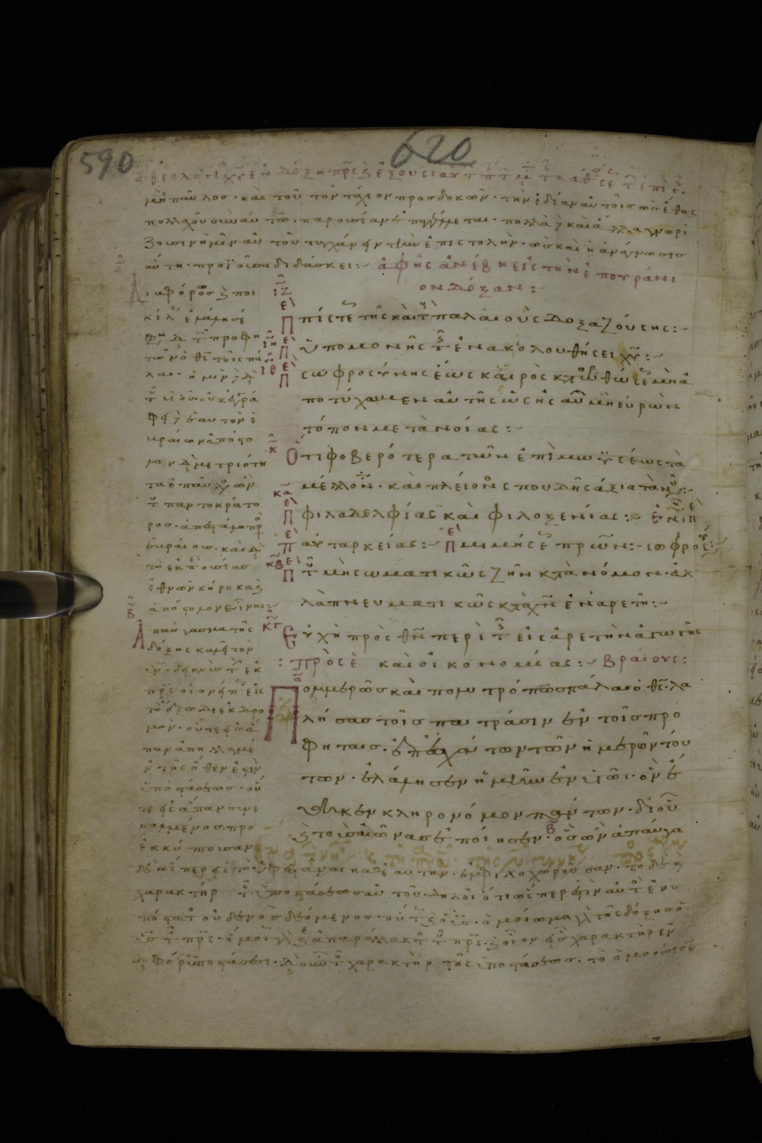 Eleventh or twelfth century minuscule of the Apostolos and Paul with commentary on parchment; 321 leaves. The New Testament text is written in the center with commentary wrapped on all sides. Images were taken at the National Library of Greece in Athens.