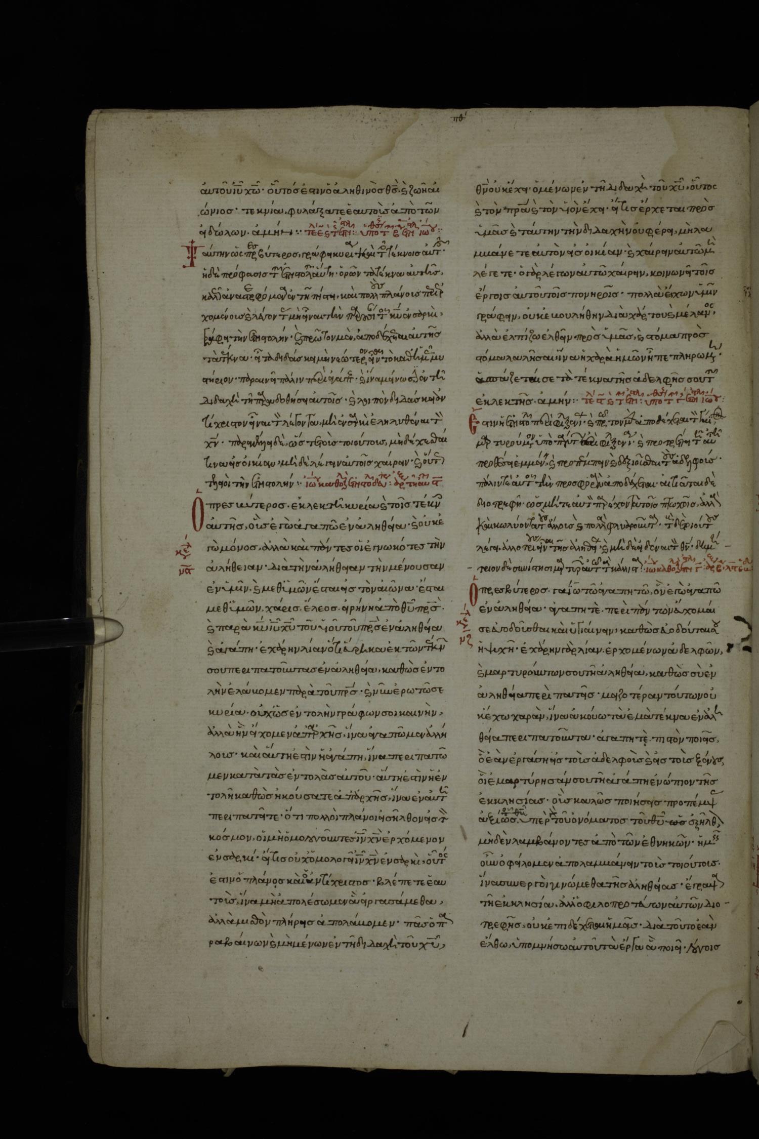 Fifteenth century minuscule of the Gospels, Apostolos, and Paul on paper; 133 leaves, 2 columns, 37 lines per column. Images were taken at the National Library of Greece in Athens.