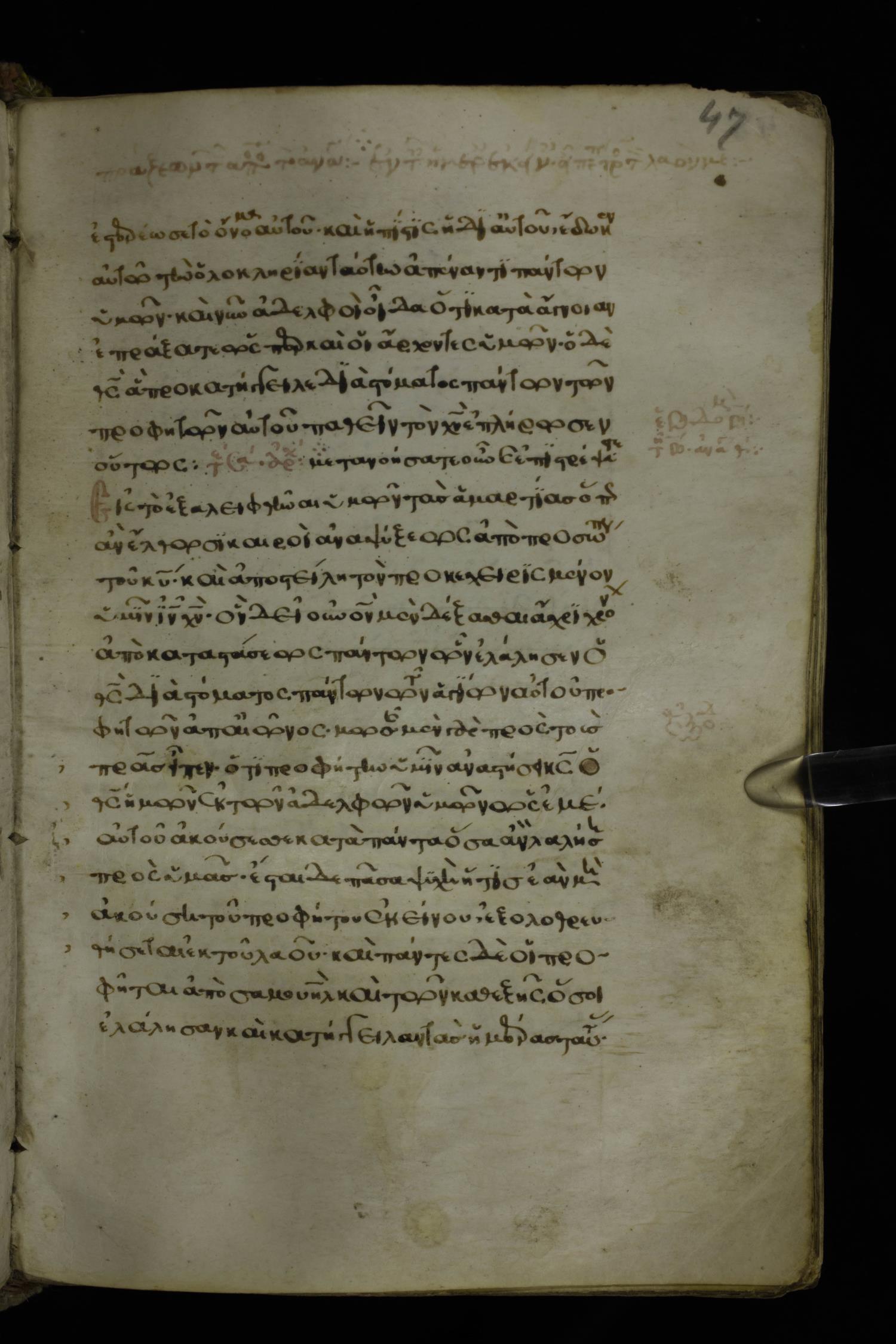 Fifteenth century minuscule of the Apostolos and Paul on parchment; 272 leaves, 1 column, 20-22 lines per column. Images were taken at the National Library of Greece in Athens.