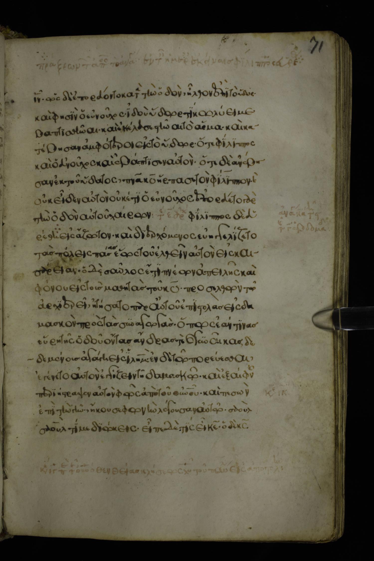 Fifteenth century minuscule of the Apostolos and Paul on parchment; 272 leaves, 1 column, 20-22 lines per column. Images were taken at the National Library of Greece in Athens.