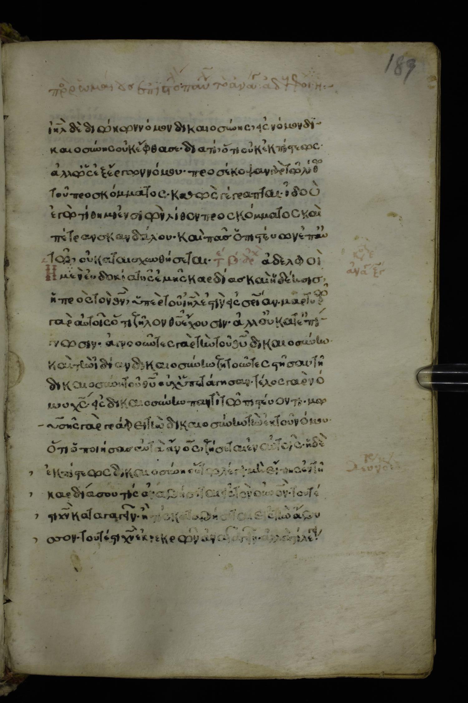 Fifteenth century minuscule of the Apostolos and Paul on parchment; 272 leaves, 1 column, 20-22 lines per column. Images were taken at the National Library of Greece in Athens.
