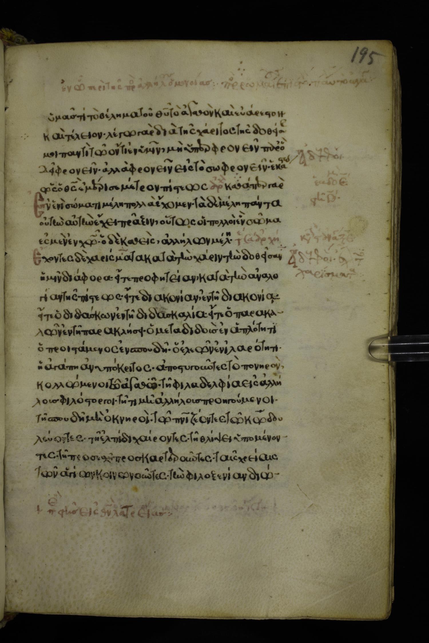 Fifteenth century minuscule of the Apostolos and Paul on parchment; 272 leaves, 1 column, 20-22 lines per column. Images were taken at the National Library of Greece in Athens.
