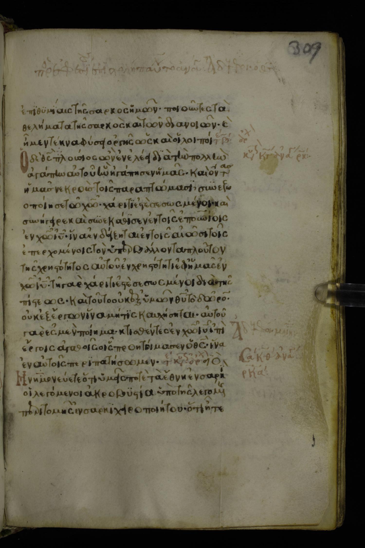 Fifteenth century minuscule of the Apostolos and Paul on parchment; 272 leaves, 1 column, 20-22 lines per column. Images were taken at the National Library of Greece in Athens.