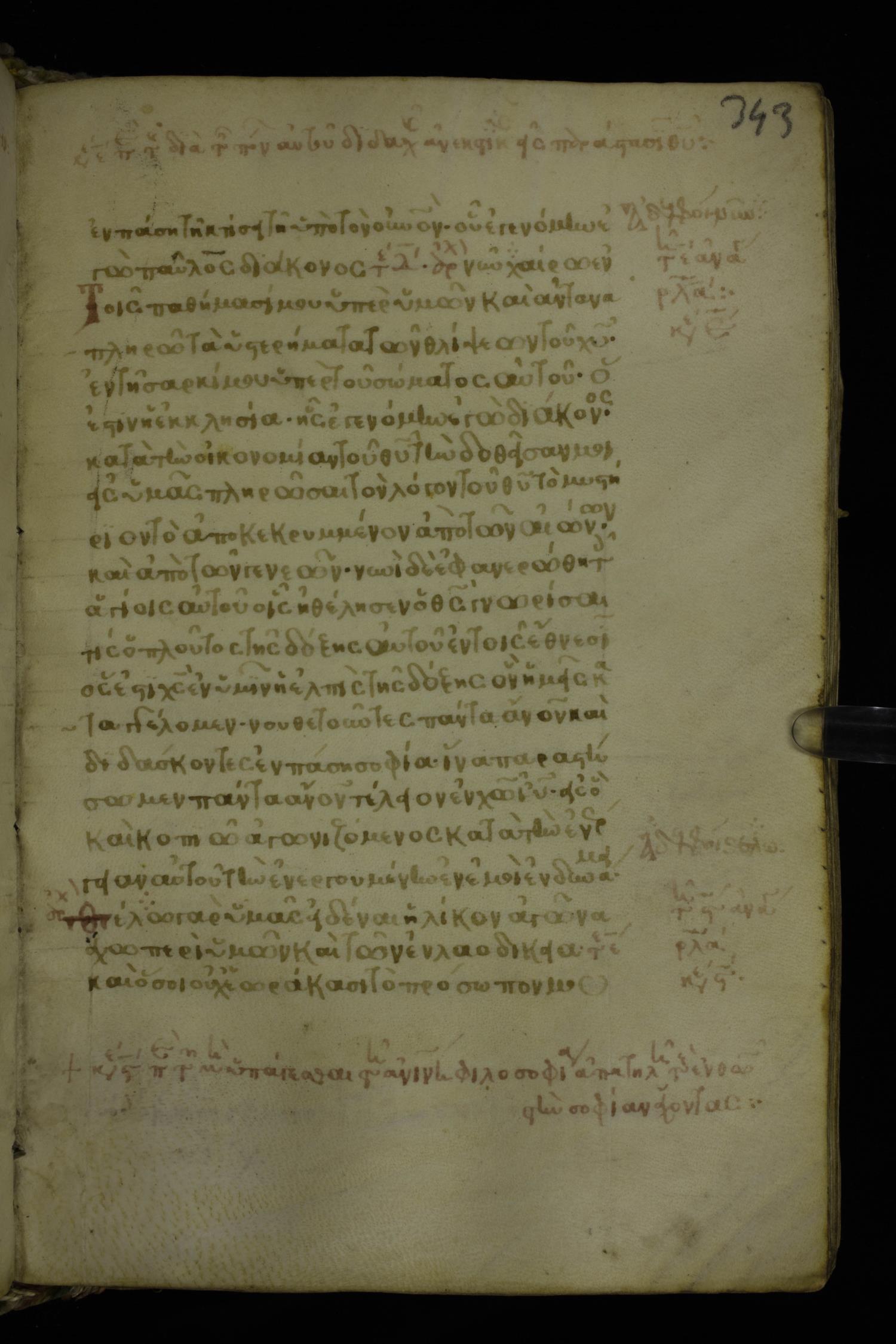Fifteenth century minuscule of the Apostolos and Paul on parchment; 272 leaves, 1 column, 20-22 lines per column. Images were taken at the National Library of Greece in Athens.