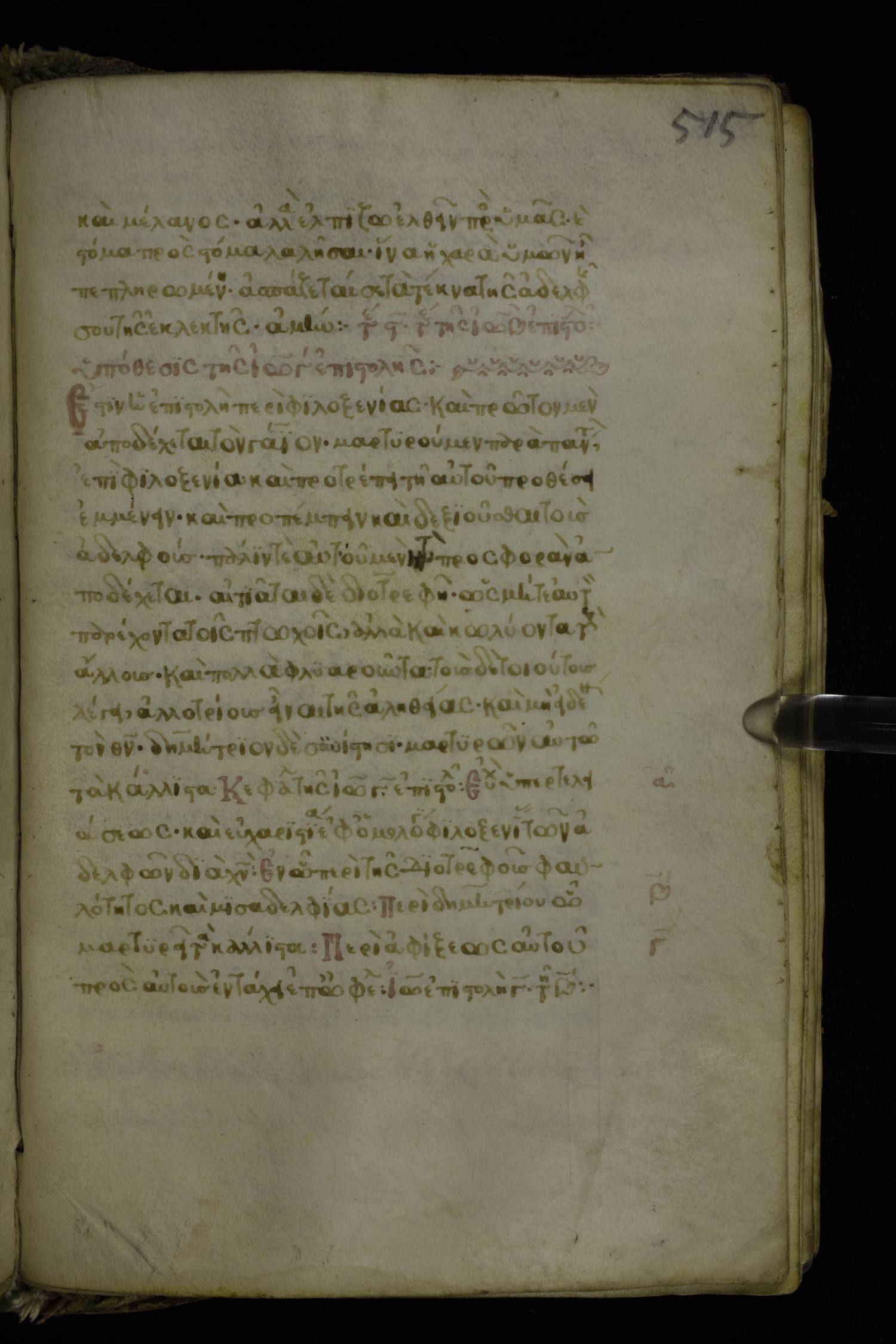 Fifteenth century minuscule of the Apostolos and Paul on parchment; 272 leaves, 1 column, 20-22 lines per column. Images were taken at the National Library of Greece in Athens.