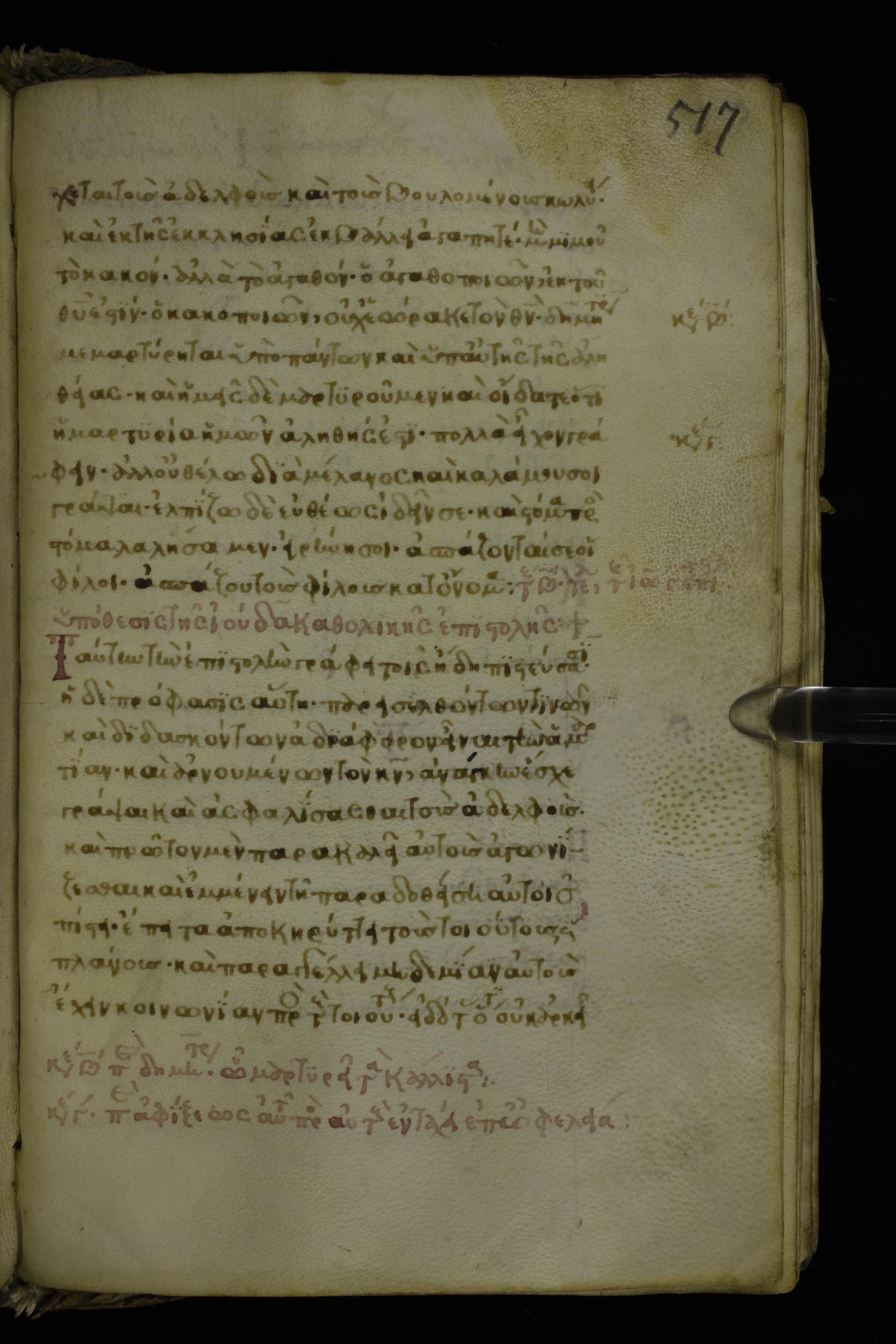 Fifteenth century minuscule of the Apostolos and Paul on parchment; 272 leaves, 1 column, 20-22 lines per column. Images were taken at the National Library of Greece in Athens.