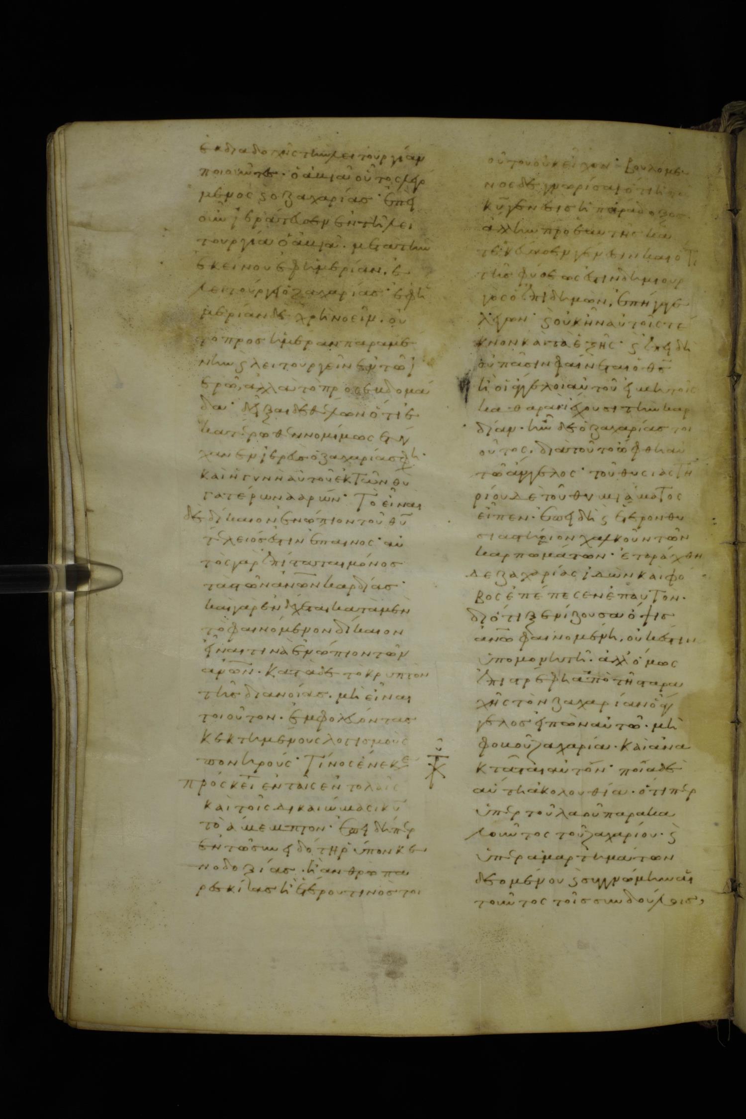 Tenth or eleventh century minuscule of the Gospels on parchment; 163 leaves, 2 columns, 27-43 lines per column. Images were taken at the National Library of Greece in Athens.