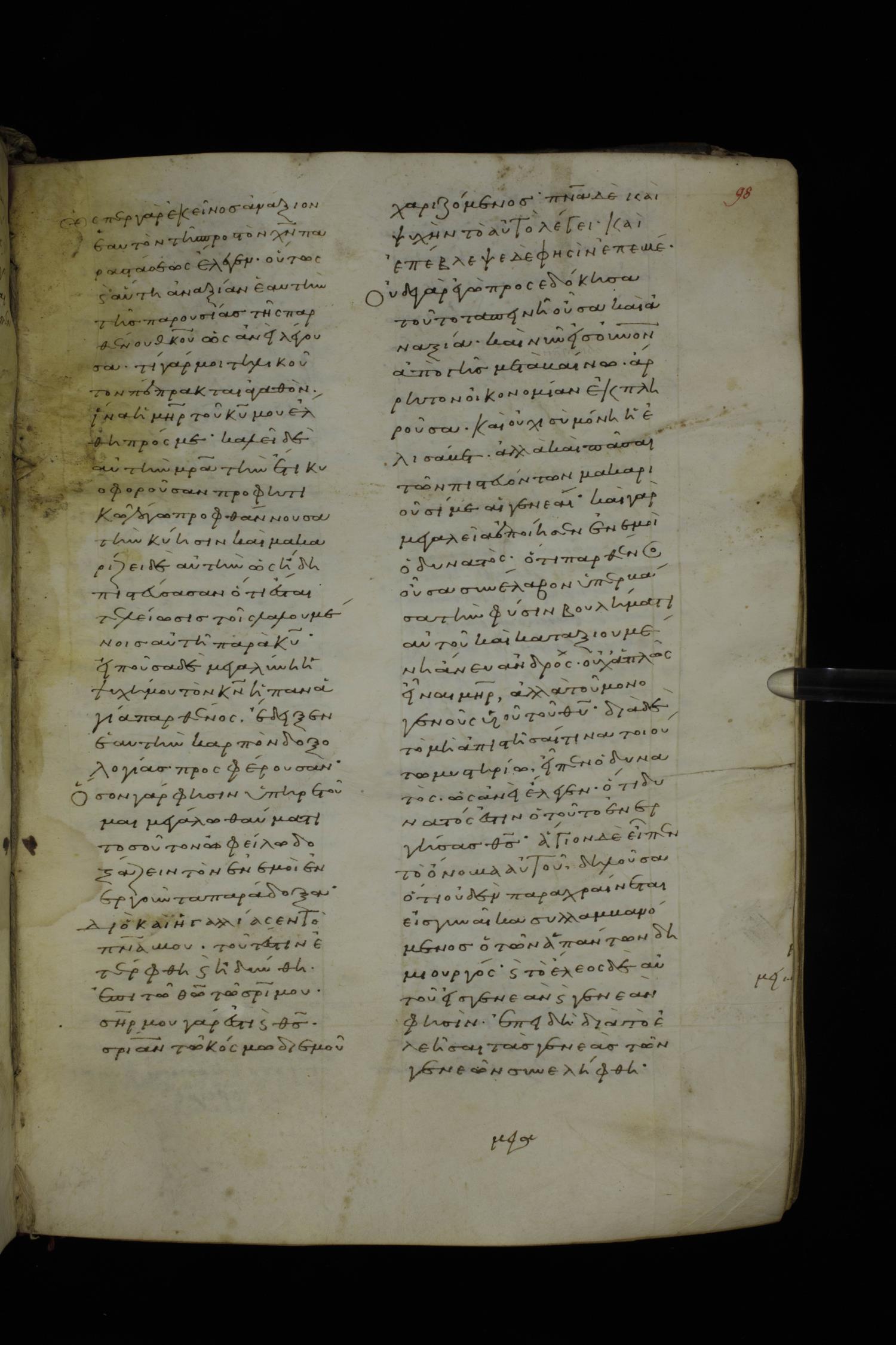 Tenth or eleventh century minuscule of the Gospels on parchment; 163 leaves, 2 columns, 27-43 lines per column. Images were taken at the National Library of Greece in Athens.