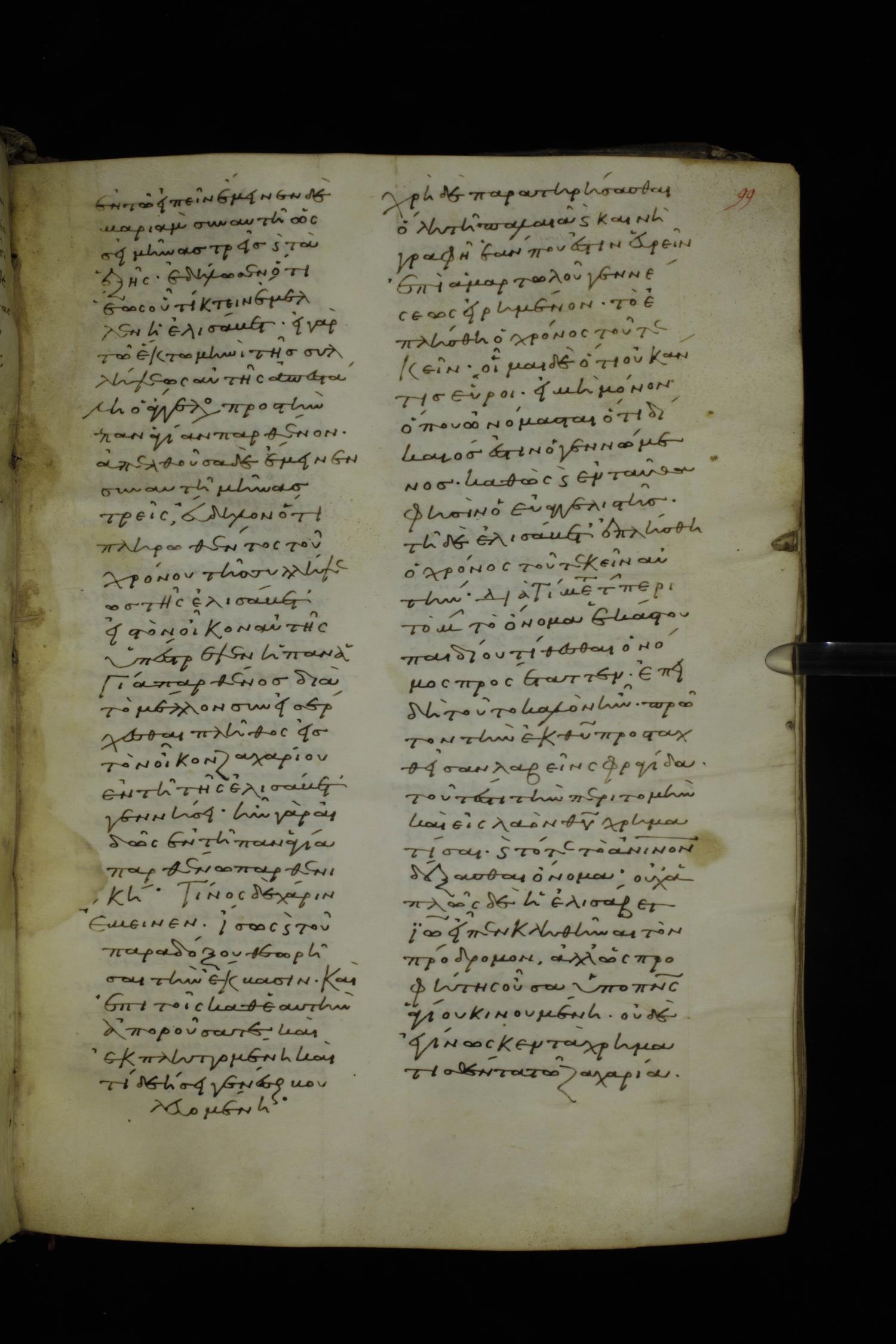 Tenth or eleventh century minuscule of the Gospels on parchment; 163 leaves, 2 columns, 27-43 lines per column. Images were taken at the National Library of Greece in Athens.