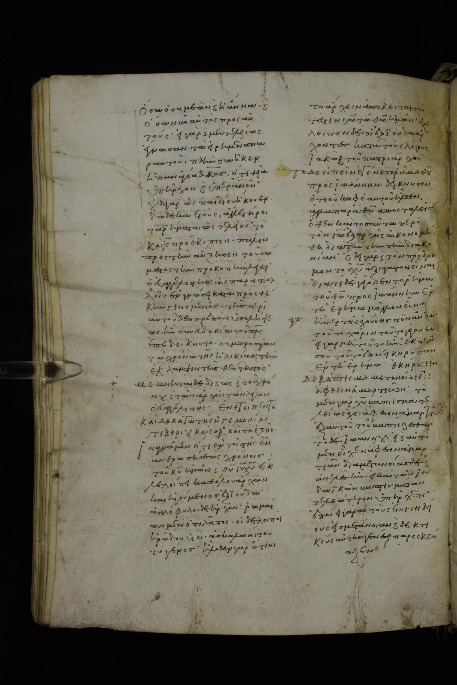 Tenth or eleventh century minuscule of the Gospels on parchment; 163 leaves, 2 columns, 27-43 lines per column. Images were taken at the National Library of Greece in Athens.
