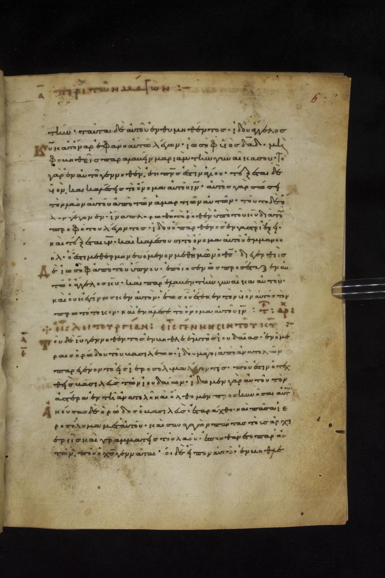 Eleventh century minuscule of the Gospels on parchment; 231 leaves, 1 column, 24 lines per column. Images were taken at the National Library of Greece in Athens.