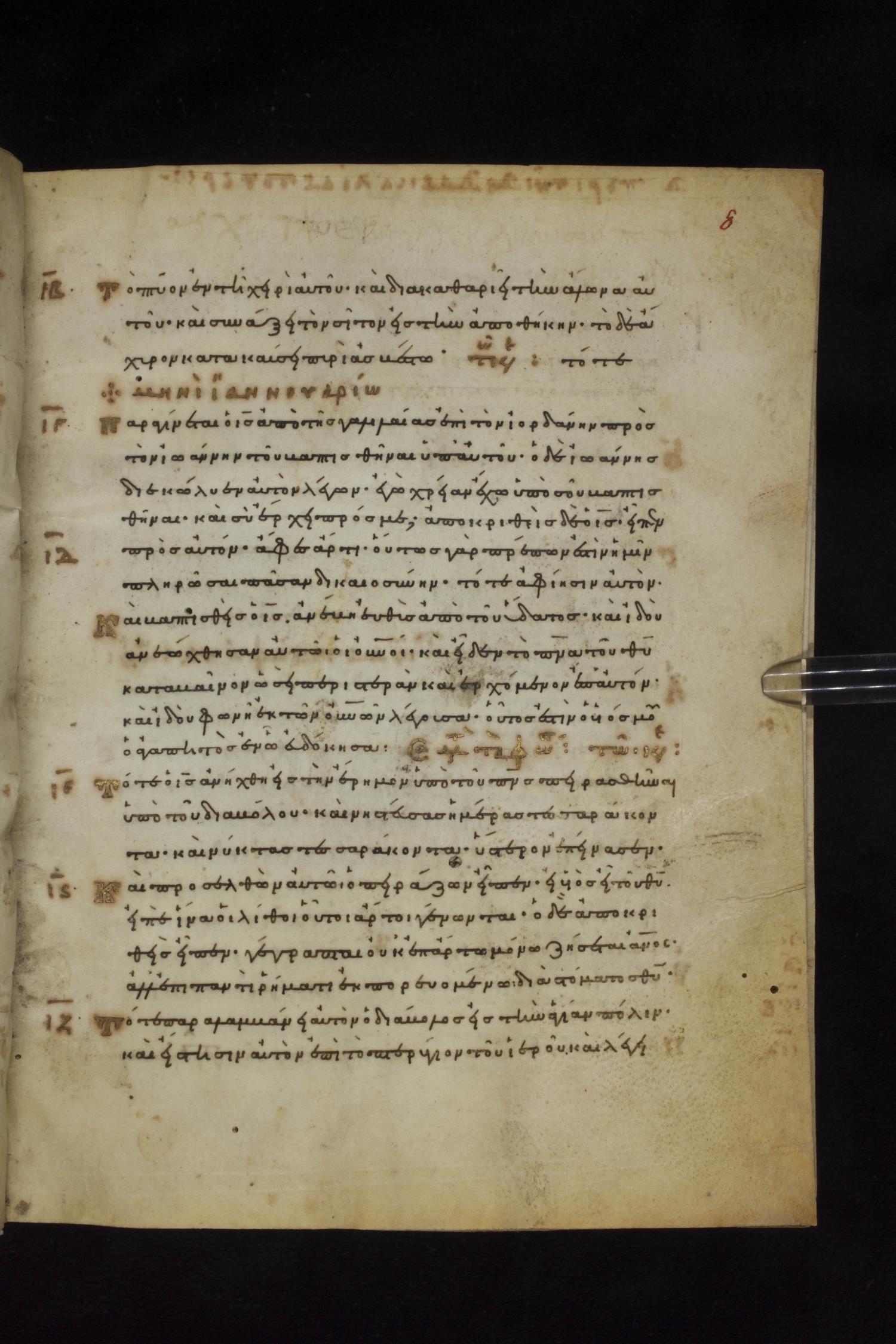 Eleventh century minuscule of the Gospels on parchment; 231 leaves, 1 column, 24 lines per column. Images were taken at the National Library of Greece in Athens.