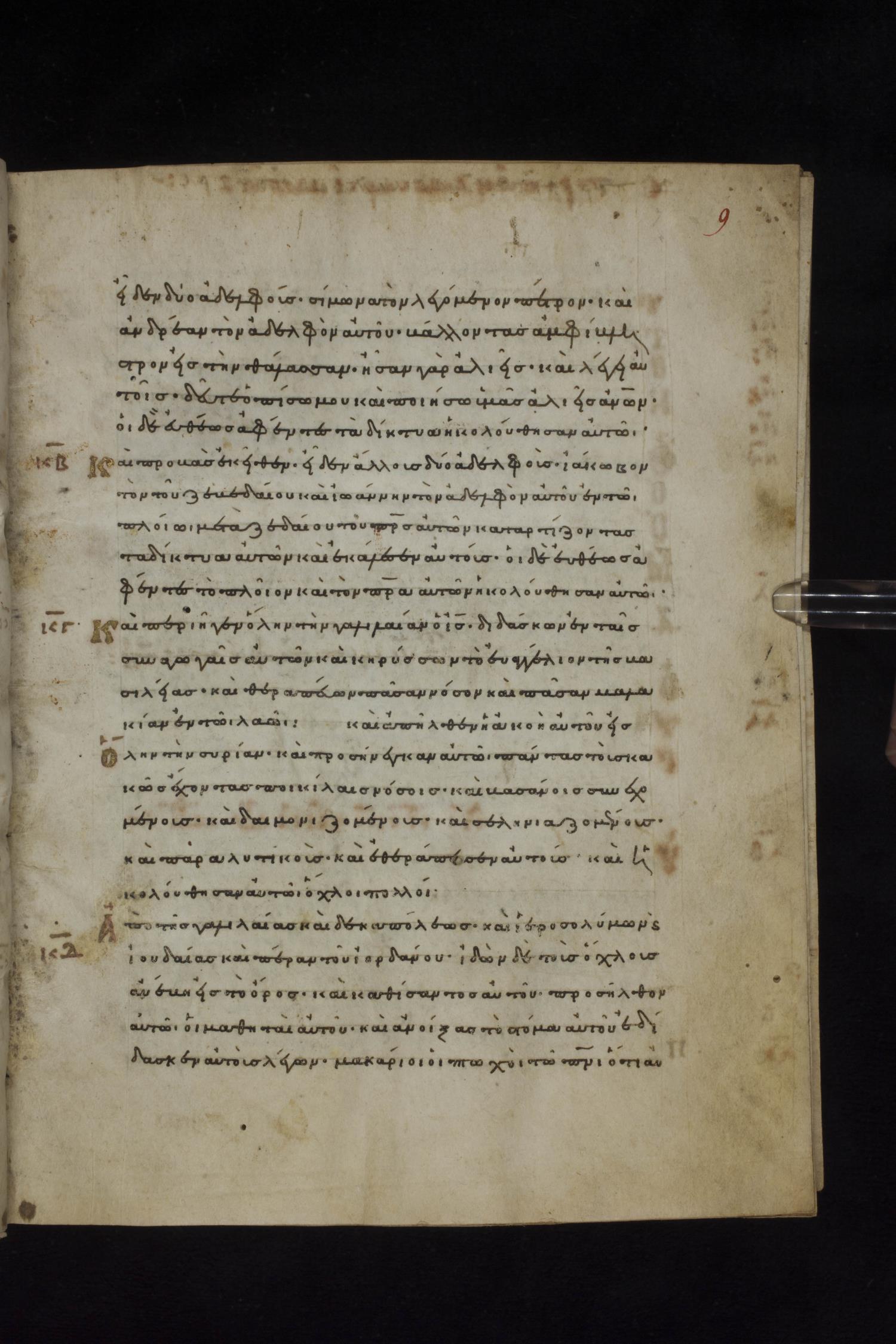 Eleventh century minuscule of the Gospels on parchment; 231 leaves, 1 column, 24 lines per column. Images were taken at the National Library of Greece in Athens.
