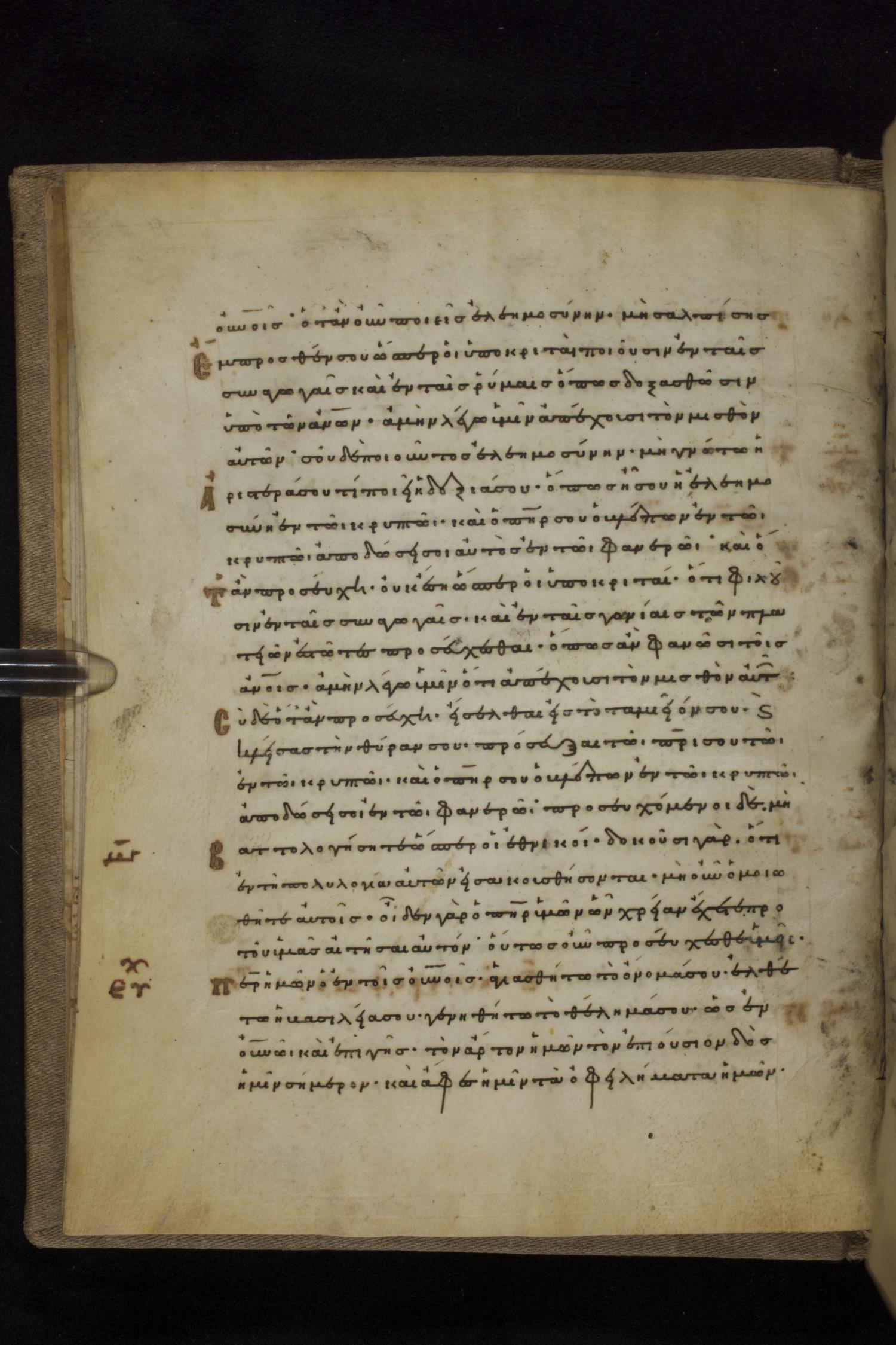 Eleventh century minuscule of the Gospels on parchment; 231 leaves, 1 column, 24 lines per column. Images were taken at the National Library of Greece in Athens.