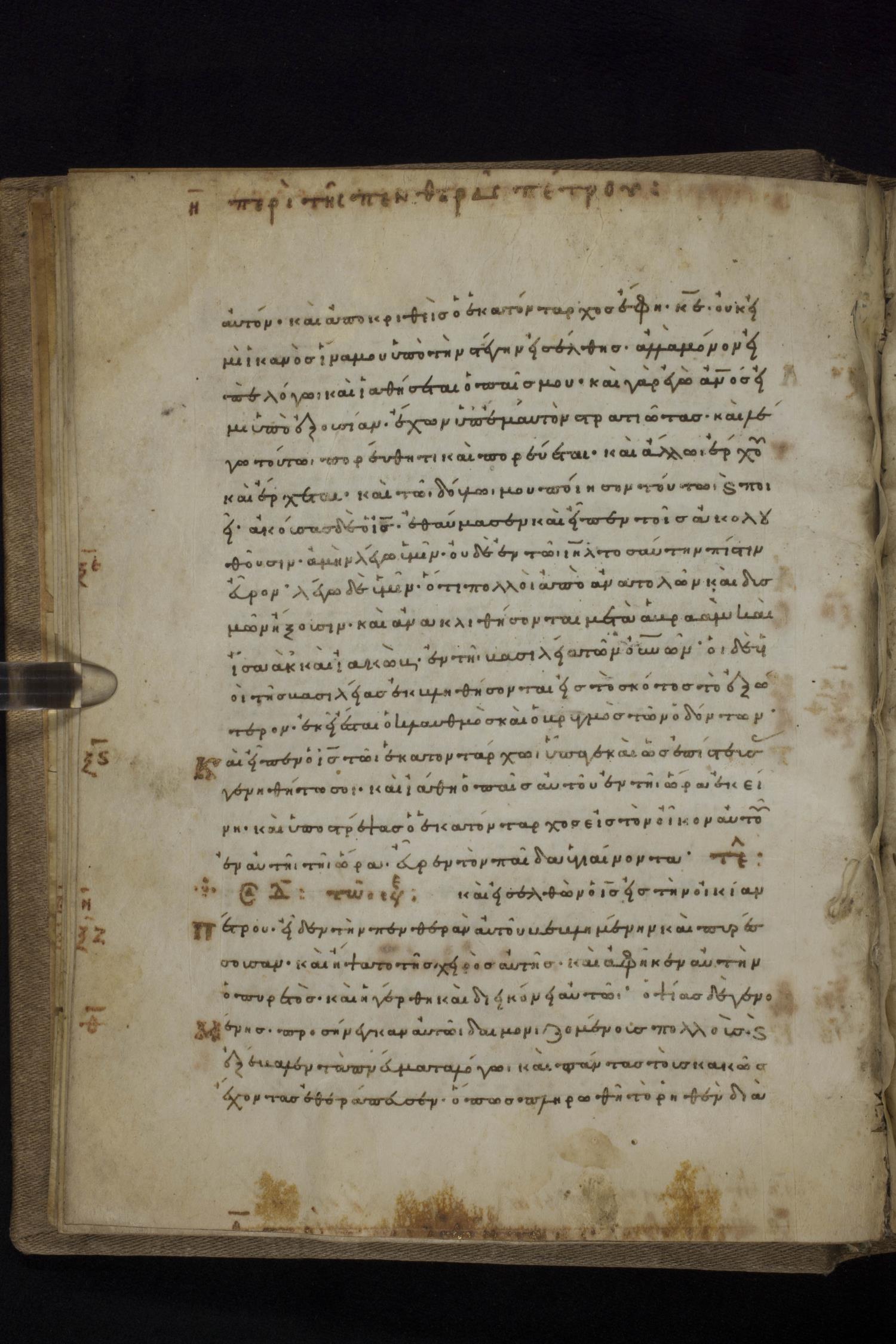 Eleventh century minuscule of the Gospels on parchment; 231 leaves, 1 column, 24 lines per column. Images were taken at the National Library of Greece in Athens.