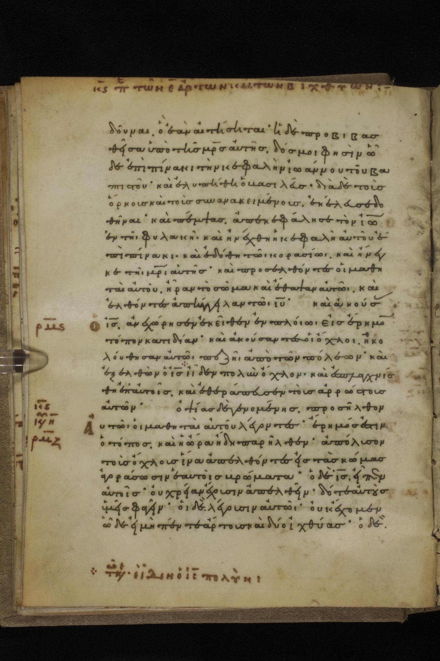 Eleventh century minuscule of the Gospels on parchment; 231 leaves, 1 column, 24 lines per column. Images were taken at the National Library of Greece in Athens.