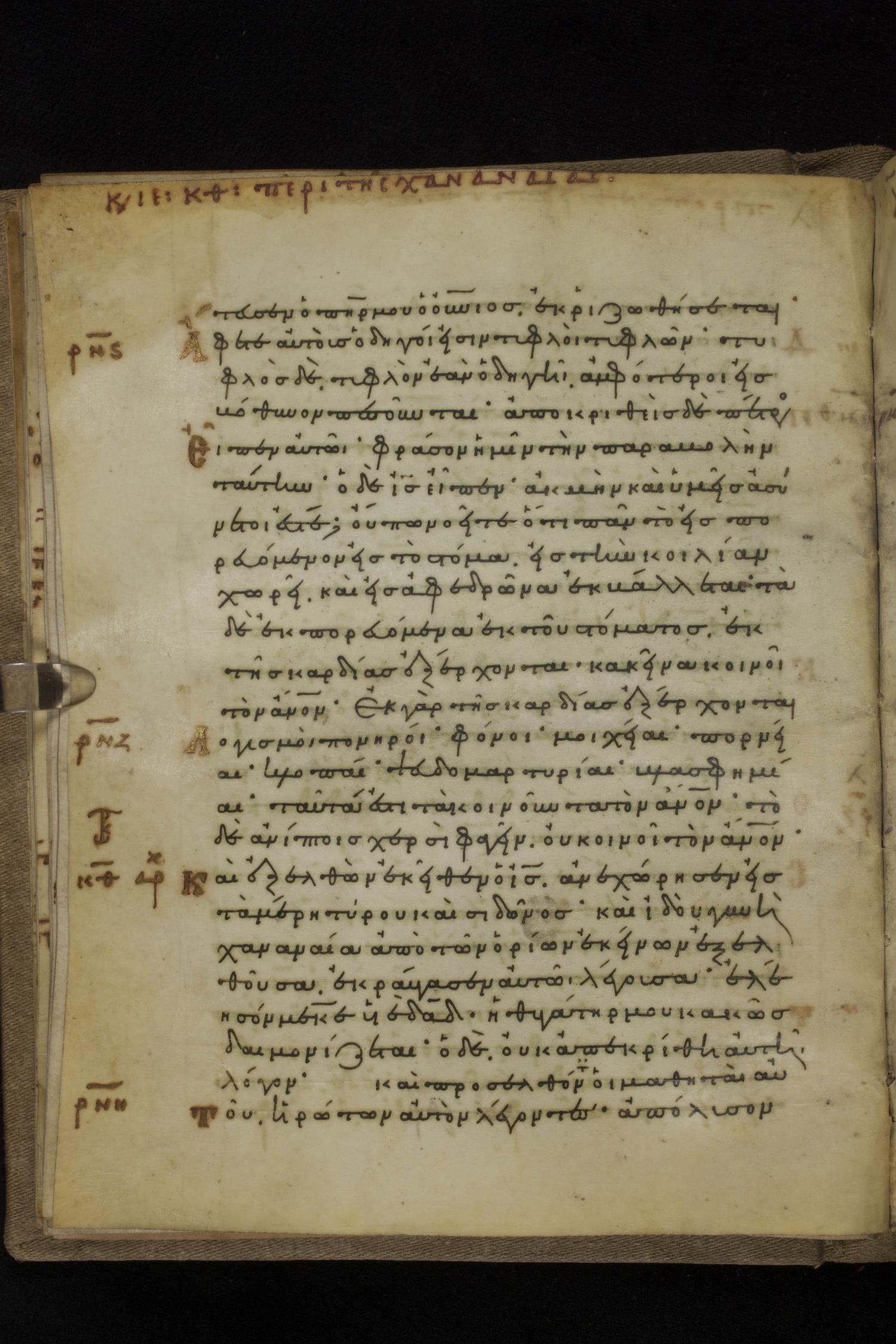 Eleventh century minuscule of the Gospels on parchment; 231 leaves, 1 column, 24 lines per column. Images were taken at the National Library of Greece in Athens.