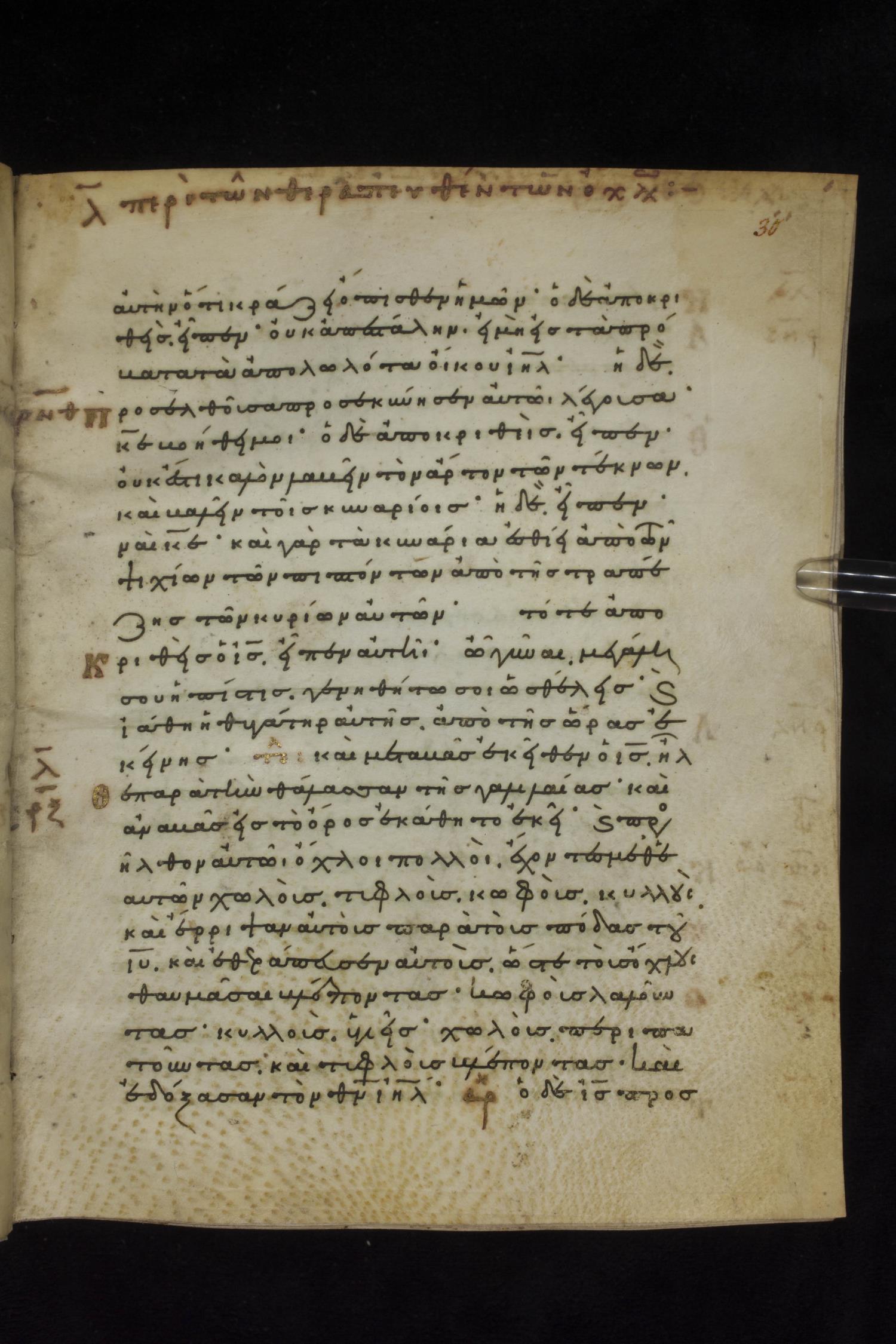 Eleventh century minuscule of the Gospels on parchment; 231 leaves, 1 column, 24 lines per column. Images were taken at the National Library of Greece in Athens.