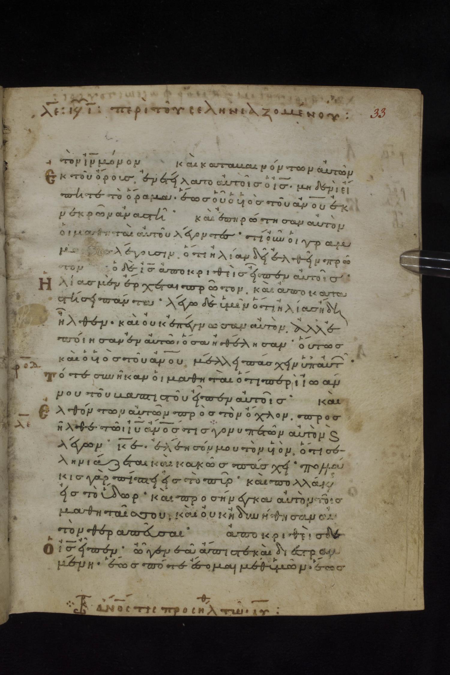 Eleventh century minuscule of the Gospels on parchment; 231 leaves, 1 column, 24 lines per column. Images were taken at the National Library of Greece in Athens.